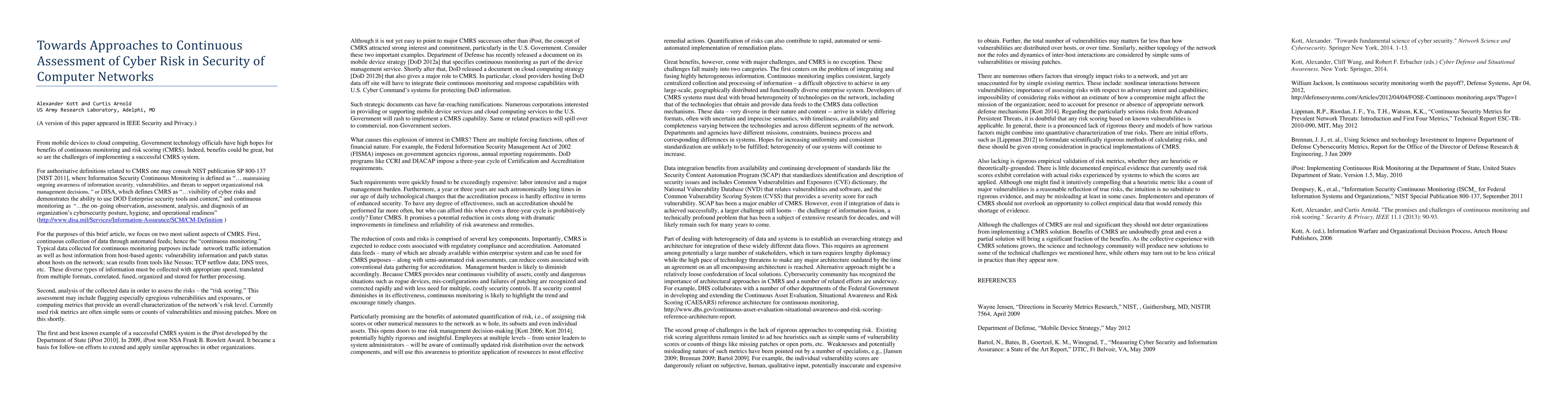 We review the current status and research challenges in the area of cyber security often called continuous monitoring and risk scoring (CMRS). We focus on two most salient aspects of CMRS. First, continuous collection of data through automated feeds; hence the term continuous monitoring. Typical data collected for continuous monitoring purposes include network traffic information as well as host information from host-based agents. Second, analysis of the collected data in order to assess the risks - the risk scoring. This assessment may include flagging especially egregious vulnerabilities and exposures, or computing metrics that provide an overall characterization of the network's risk level. Currently used risk metrics are often simple sums or counts of vulnerabilities and missing patches. The research challenges pertaining to CMRS fall mainly into two categories. The first centers on the problem of integrating and fusing highly heterogeneous information. The second group of challenges is the lack of rigorous approaches to computing risk. Existing risk scoring algorithms remain limited to ad hoc heuristics such as simple sums of vulnerability scores or counts of things like missing patches or open ports, etc. Weaknesses and potentially misleading nature of such metrics are well recognized. For example, the individual vulnerability scores are dangerously reliant on subjective, human, qualitative input, potentially inaccurate and expensive to obtain. Further, the total number of vulnerabilities may matters far less than how vulnerabilities are distributed over hosts, or over time. Similarly, neither topology of the network nor the roles and dynamics of inter-host interactions are considered by simple sums of vulnerabilities or missing patches.