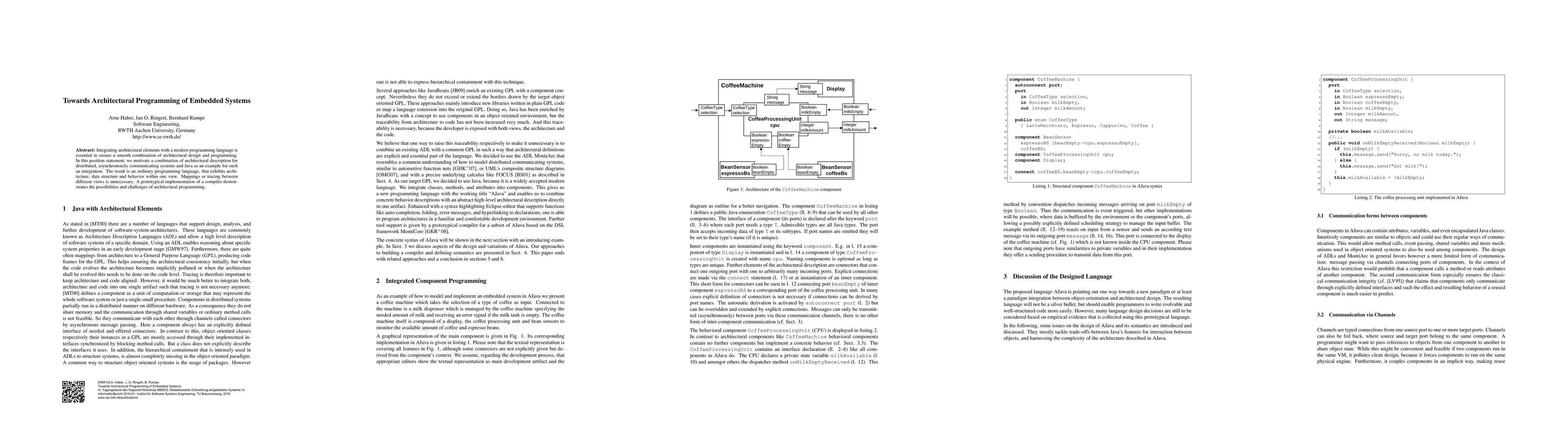 Integrating architectural elements with a modern programming language is essential to ensure a smooth combination of architectural design and programming. In this position statement, we motivate a combination of architectural description for distributed, asynchronously communicating systems and Java as an example for such an integration. The result is an ordinary programming language, that exhibits architecture, data structure and behavior within one view. Mappings or tracing between different views is unnecessary. A prototypical implementation of a compiler demonstrates the possibilities and challenges of architectural programming.