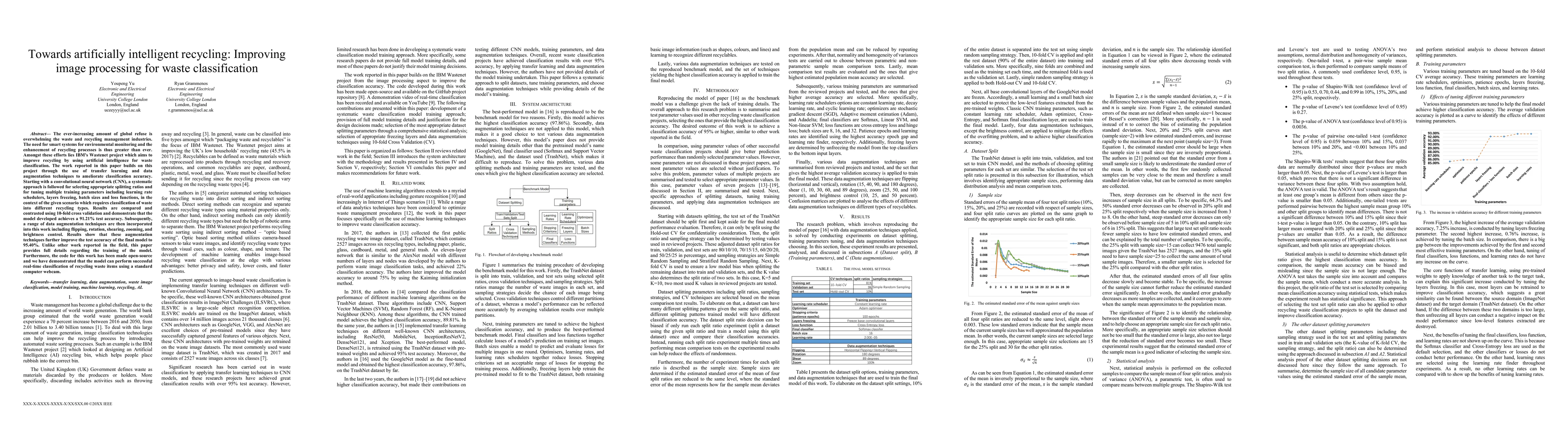 The ever-increasing amount of global refuse is overwhelming the waste and recycling management industries. The need for smart systems for environmental monitoring and the enhancement of recycling processes is thus greater than ever. Amongst these efforts lies IBM's Wastenet project which aims to improve recycling by using artificial intelligence for waste classification. The work reported in this paper builds on this project through the use of transfer learning and data augmentation techniques to ameliorate classification accuracy. Starting with a convolutional neural network (CNN), a systematic approach is followed for selecting appropriate splitting ratios and for tuning multiple training parameters including learning rate schedulers, layers freezing, batch sizes and loss functions, in the context of the given scenario which requires classification of waste into different recycling types. Results are compared and contrasted using 10-fold cross validation and demonstrate that the model developed achieves a 91.21% test accuracy. Subsequently, a range of data augmentation techniques are then incorporated into this work including flipping, rotation, shearing, zooming, and brightness control. Results show that these augmentation techniques further improve the test accuracy of the final model to 95.40%. Unlike other work reported in the field, this paper provides full details regarding the training of the model. Furthermore, the code for this work has been made open-source and we have demonstrated that the model can perform successful real-time classification of recycling waste items using a standard computer webcam.