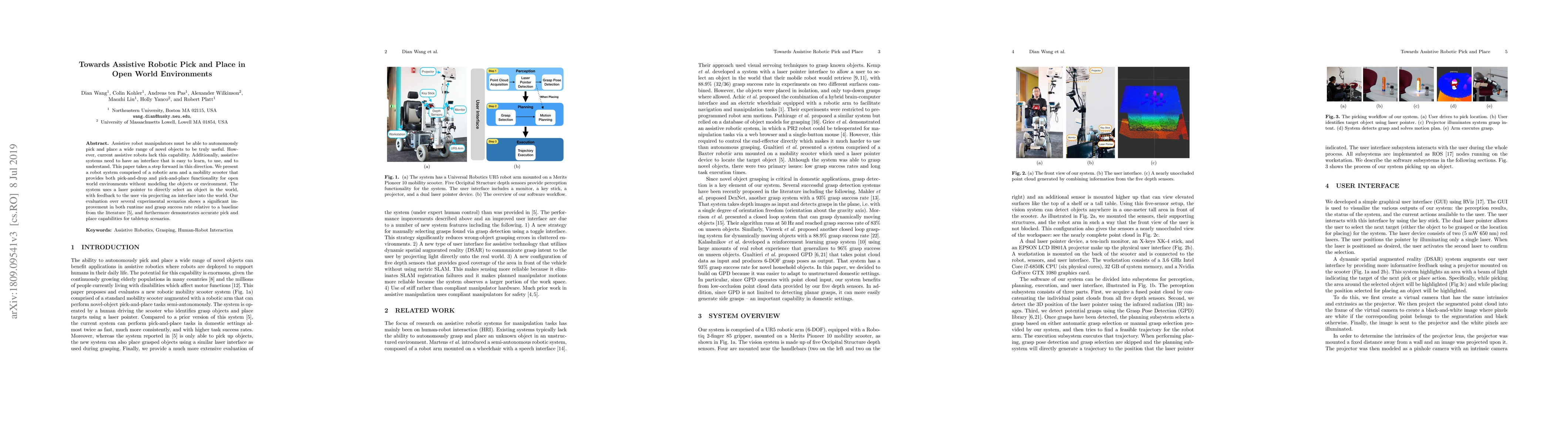 This paper introduces an assistive robotic system combining a robotic arm and a mobility scooter to autonomously pick and place novel objects in open environments without prior object or environment modeling. The system uses a laser pointer for direct object selection and projects an interface for user feedback, showing improved runtime and grasp success compared to existing methods.