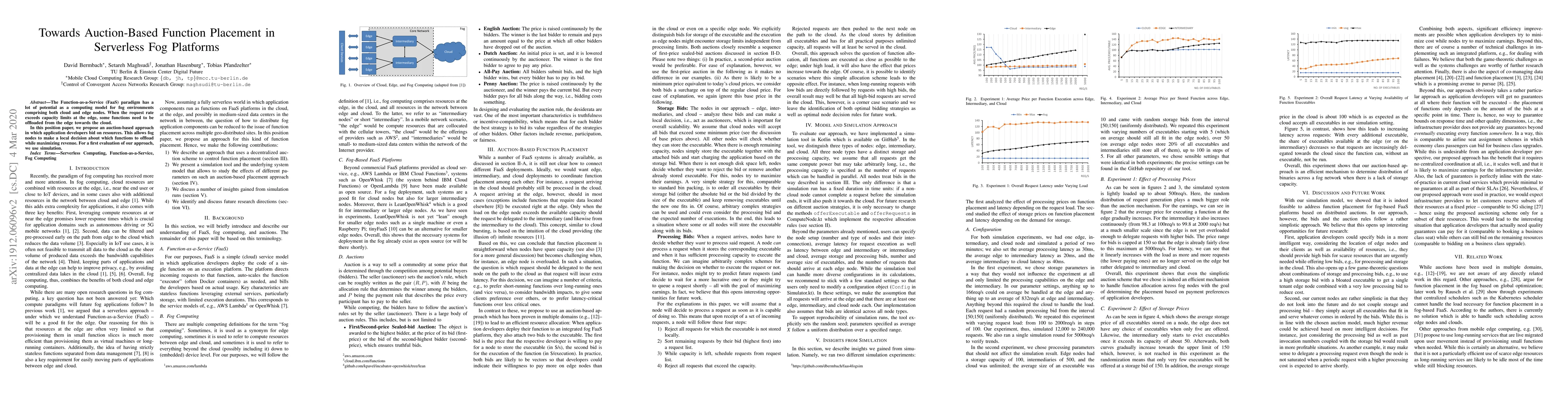 The Function-as-a-Service (FaaS) paradigm has a lot of potential as a computing model for fog environments comprising both cloud and edge nodes. When the request rate exceeds capacity limits at the edge, some functions need to be offloaded from the edge towards the cloud. In this position paper, we propose an auction-based approach in which application developers bid on resources. This allows fog nodes to make a local decision about which functions to offload while maximizing revenue. For a first evaluation of our approach, we use simulation.