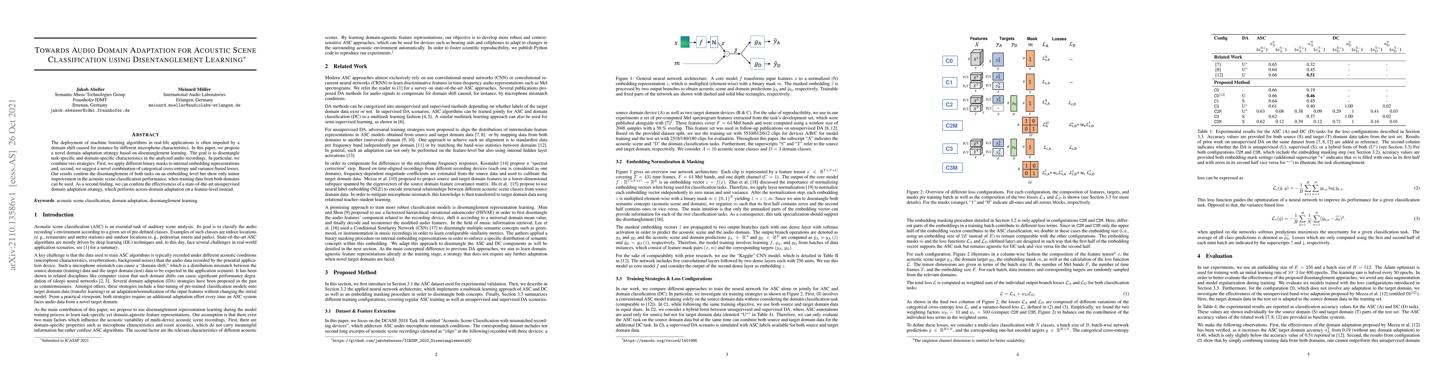 This paper proposes a domain adaptation strategy using disentanglement learning to address the domain shift in acoustic scene classification caused by different microphone characteristics. The approach combines binary masking and a novel loss function, but shows only minor improvements in classification performance despite successful disentanglement.