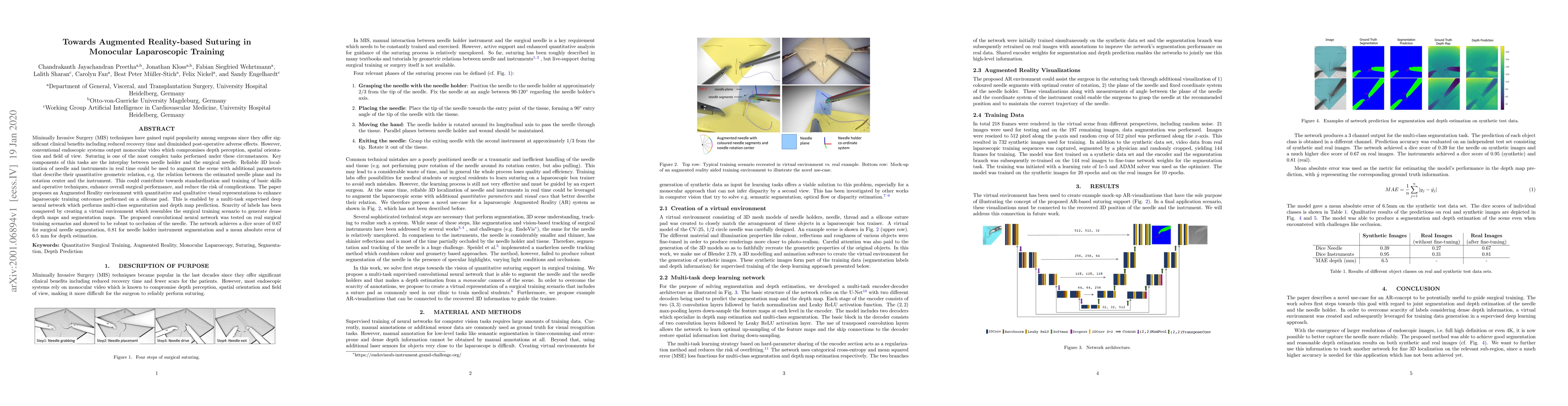 Minimally Invasive Surgery (MIS) techniques have gained rapid popularity among surgeons since they offer significant clinical benefits including reduced recovery time and diminished post-operative adverse effects. However, conventional endoscopic systems output monocular video which compromises depth perception, spatial orientation and field of view. Suturing is one of the most complex tasks performed under these circumstances. Key components of this tasks are the interplay between needle holder and the surgical needle. Reliable 3D localization of needle and instruments in real time could be used to augment the scene with additional parameters that describe their quantitative geometric relation, e.g. the relation between the estimated needle plane and its rotation center and the instrument. This could contribute towards standardization and training of basic skills and operative techniques, enhance overall surgical performance, and reduce the risk of complications. The paper proposes an Augmented Reality environment with quantitative and qualitative visual representations to enhance laparoscopic training outcomes performed on a silicone pad. This is enabled by a multi-task supervised deep neural network which performs multi-class segmentation and depth map prediction. Scarcity of labels has been conquered by creating a virtual environment which resembles the surgical training scenario to generate dense depth maps and segmentation maps. The proposed convolutional neural network was tested on real surgical training scenarios and showed to be robust to occlusion of the needle. The network achieves a dice score of 0.67 for surgical needle segmentation, 0.81 for needle holder instrument segmentation and a mean absolute error of 6.5 mm for depth estimation.