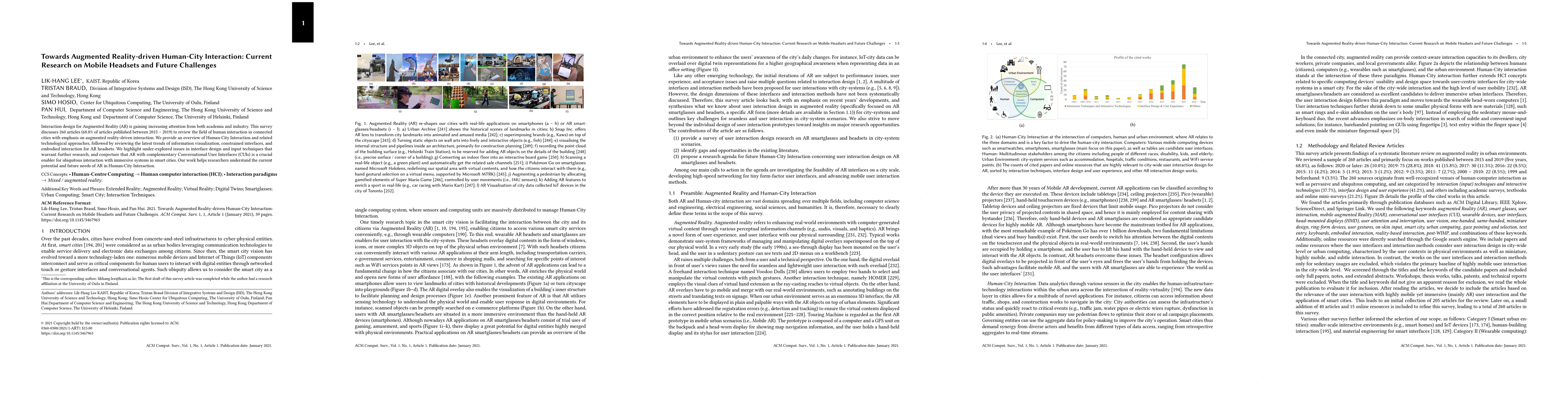 This paper surveys the current state of Augmented Reality (AR) in human-city interaction, reviewing 260 articles to analyze trends in information visualization and interface design for AR headsets. It highlights future challenges and the potential of AR combined with Conversational User Interfaces for enhancing smart city interactions.