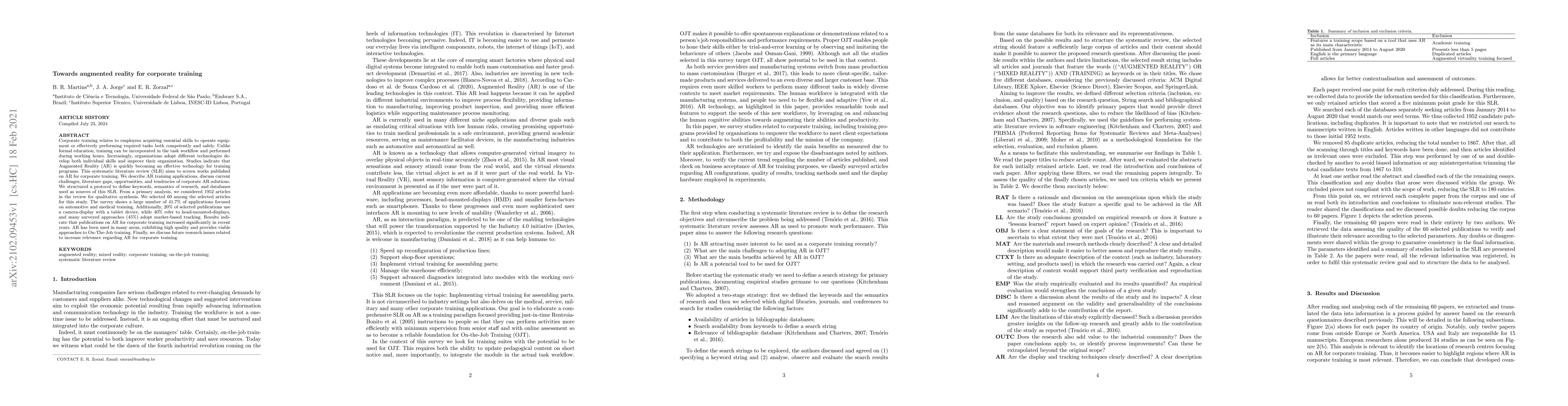 This paper reviews literature on Augmented Reality (AR) applications for corporate training, highlighting its growing adoption and effectiveness in skill development. The study identifies key trends, challenges, and opportunities in AR-based training, with a significant focus on automotive and medical sectors, and discusses future research directions.