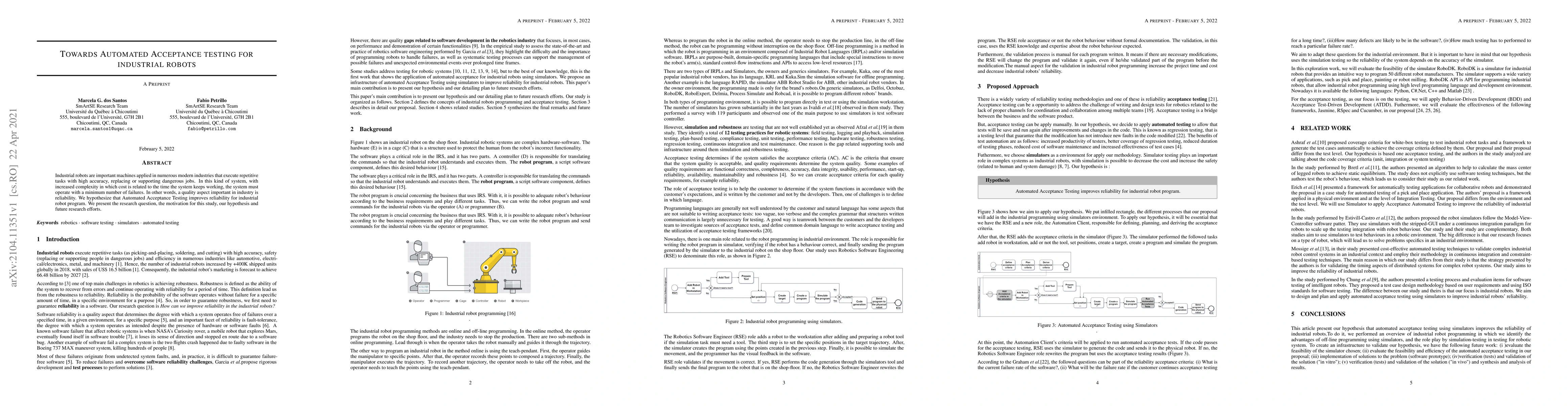 Industrial robots are important machines applied in numerous modern industries that execute repetitive tasks with high accuracy, replacing or supporting dangerous jobs. In this kind of system, with increased complexity in which cost is related to the time the system keeps working, the system must operate with a minimum number of failures. In other words, a quality aspect important in industry is reliability. We hypothesize that Automated Acceptance Testing improves reliability for industrial robot program. We present the research question, the motivation for this study, our hypothesis and future research efforts.
