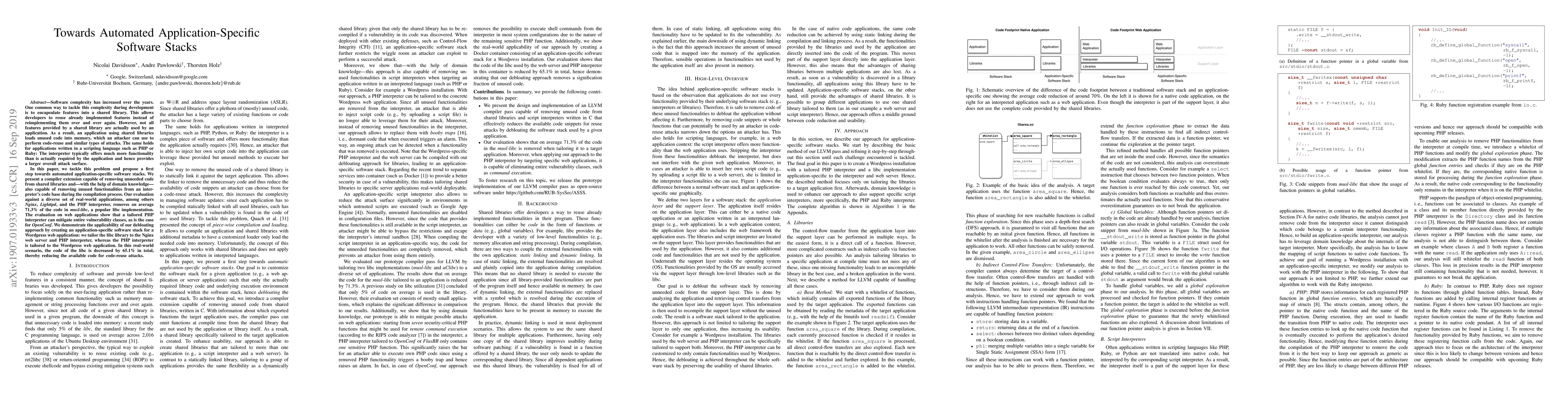 Software complexity has increased over the years. One common way to tackle this complexity during development is to encapsulate features into a shared library. This allows developers to reuse already implemented features instead of reimplementing them over and over again. However, not all features provided by a shared library are actually used by an application. As a result, an application using shared libraries loads unused code into memory, which an attacker can use to perform code-reuse and similar types of attacks. The same holds for applications written in a scripting language such as PHP or Ruby: The interpreter typically offers much more functionality than is actually required by the application and hence provides a larger overall attack surface. In this paper, we tackle this problem and propose a first step towards automated application-specific software stacks. We present a compiler extension capable of removing unneeded code from shared libraries and---with the help of domain knowledge---also capable of removing unused functionalities from an interpreter's code base during the compilation process. Our evaluation against a diverse set of real-world applications, among others Nginx, Lighttpd, and the PHP interpreter, removes on average 71.3% of the code in musl-libc, a popular libc implementation. The evaluation on web applications show that a tailored PHP interpreter can mitigate entire vulnerability classes, as is the case for OpenConf. We demonstrate the applicability of our debloating approach by creating an application-specific software stack for a Wordpress web application: we tailor the libc library to the Nginx web server and PHP interpreter, whereas the PHP interpreter is tailored to the Wordpress web application. In this real-world scenario, the code of the libc is decreased by 65.1% in total, thereby reducing the available code for code-reuse attacks.
