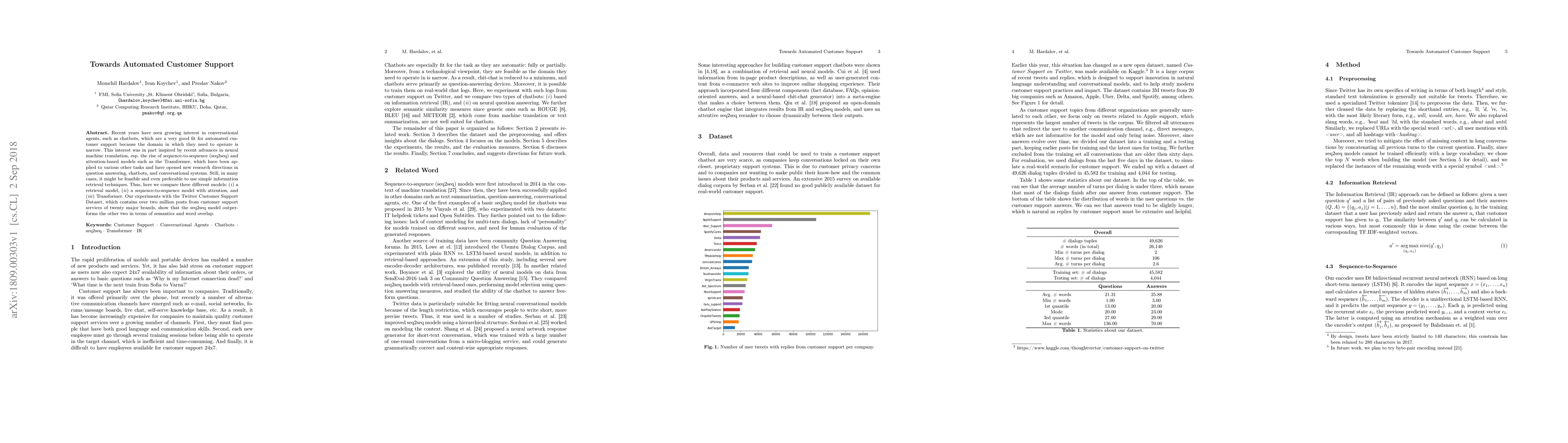 This paper compares the performance of a retrieval model, a sequence-to-sequence model with attention, and a Transformer model for automated customer support. The seq2seq model with attention outperforms the others in semantic understanding and word overlap, as demonstrated using the Twitter Customer Support Dataset.