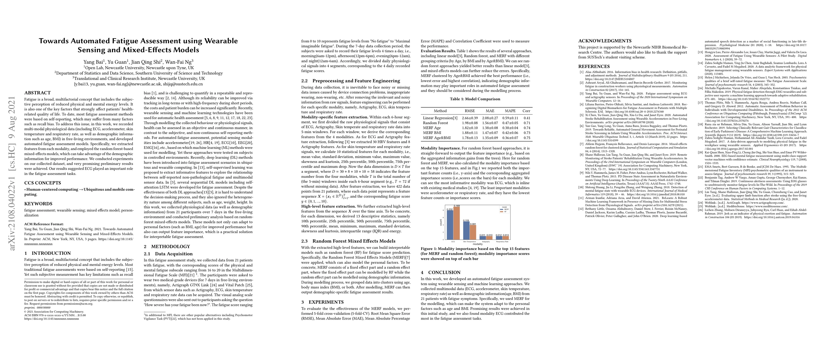 This research proposes an automated fatigue assessment system using wearable sensors collecting ECG, accelerometer, skin temperature, respiratory rate data, and demographic info. Mixed-effects models, incorporating demographic variables, were developed to analyze these features, showing promising results with ECG data being particularly significant for fatigue assessment.