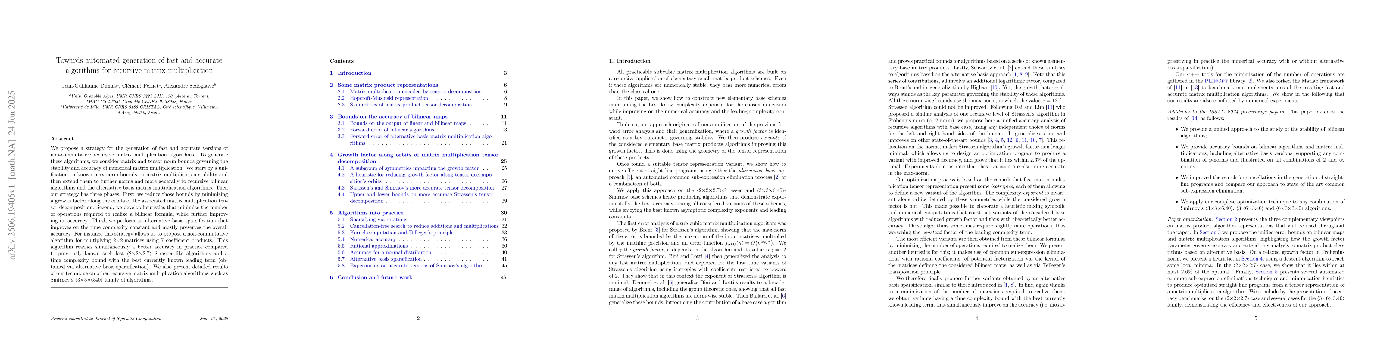 We propose a strategy for the generation of fast and accurate versions of non-commutative recursive matrix multiplication algorithms. To generate these algorithms, we consider matrix and tensor norm bounds governing the stability and accuracy of numerical matrix multiplication. We start by a unification on known max-norm bounds on matrix multiplication stability and then extend them to further norms and more generally to recursive bilinear algorithms and the alternative basis matrix multiplication algorithms. Then our strategy has three phases. First, we reduce those bounds by minimizing a growth factor along the orbits of the associated matrix multiplication tensor decomposition. Second, we develop heuristics that minimize the number of operations required to realize a bilinear formula, while further improving its accuracy. Third, we perform an alternative basis sparsification that improves on the time complexity constant and mostly preserves the overall accuracy. For instance this strategy allows us to propose a non-commutative algorithm for multiplying 2x2-matrices using 7 coefficient products. This algorithm reaches simultaneously a better accuracy in practice compared to previously known such fast ___2x2x2:7___ Strassen-like algorithms and a time complexity bound with the best currently known leading term (obtained via alternative basis sparsification). We also present detailed results of our technique on other recursive matrix multiplication algorithms, such as Smirnov's ___3x3x6:40___ family of algorithms.