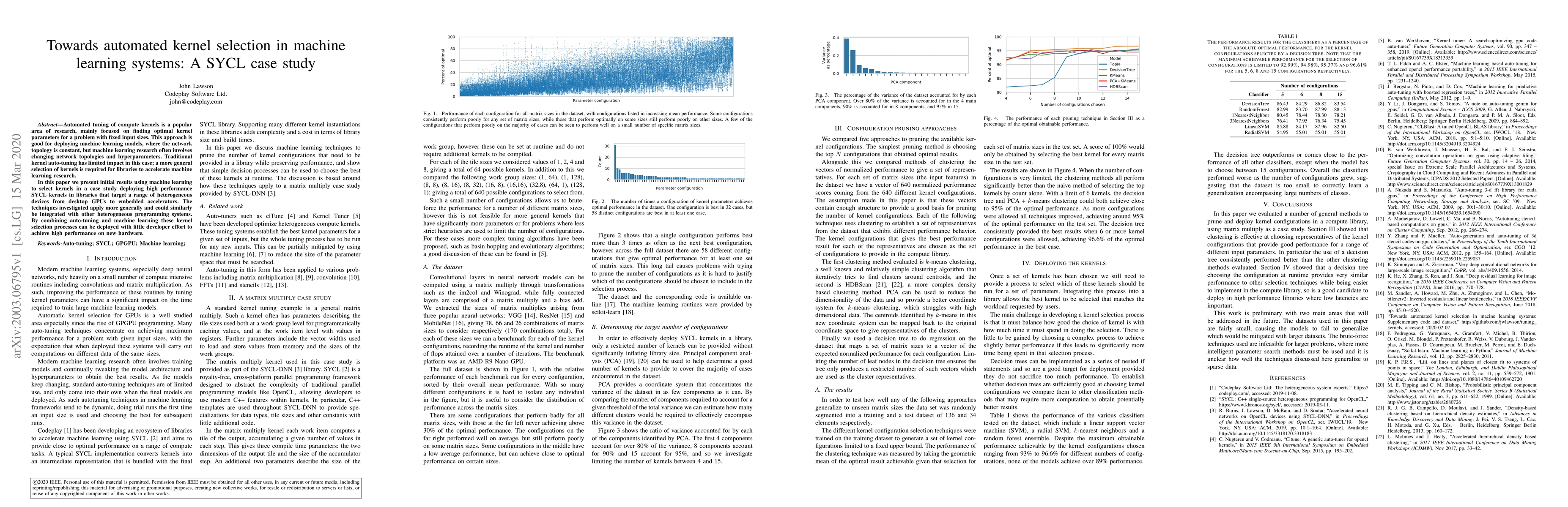 Automated tuning of compute kernels is a popular area of research, mainly focused on finding optimal kernel parameters for a problem with fixed input sizes. This approach is good for deploying machine learning models, where the network topology is constant, but machine learning research often involves changing network topologies and hyperparameters. Traditional kernel auto-tuning has limited impact in this case; a more general selection of kernels is required for libraries to accelerate machine learning research. In this paper we present initial results using machine learning to select kernels in a case study deploying high performance SYCL kernels in libraries that target a range of heterogeneous devices from desktop GPUs to embedded accelerators. The techniques investigated apply more generally and could similarly be integrated with other heterogeneous programming systems. By combining auto-tuning and machine learning these kernel selection processes can be deployed with little developer effort to achieve high performance on new hardware.