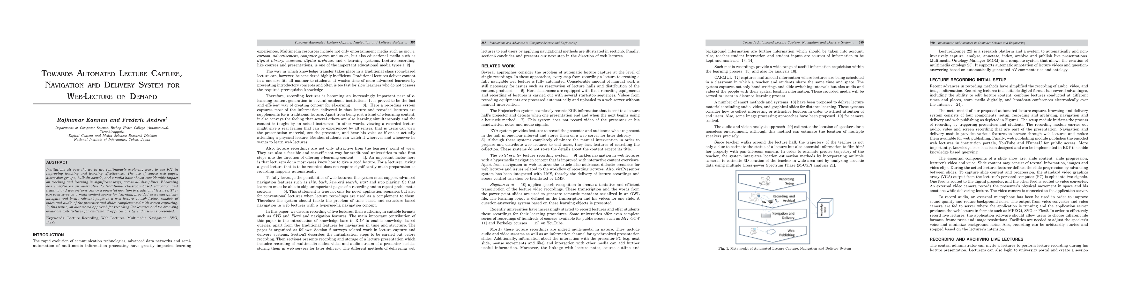 Institutions all over the world are continuously exploring ways to use ICT in improving teaching and learning effectiveness. The use of course web pages, discussion groups, bulletin boards, and e-mails have shown considerable impact on teaching and learning in significant ways, across all disciplines. ELearning has emerged as an alternative to traditional classroom-based education and training and web lectures can be a powerful addition to traditional lectures. They can even serve as a main content source for learning, provided users can quickly navigate and locate relevant pages in a web lecture. A web lecture consists of video and audio of the presenter and slides complemented with screen capturing. In this paper, an automated approach for recording live lectures and for browsing available web lectures for on-demand applications by end users is presented.
