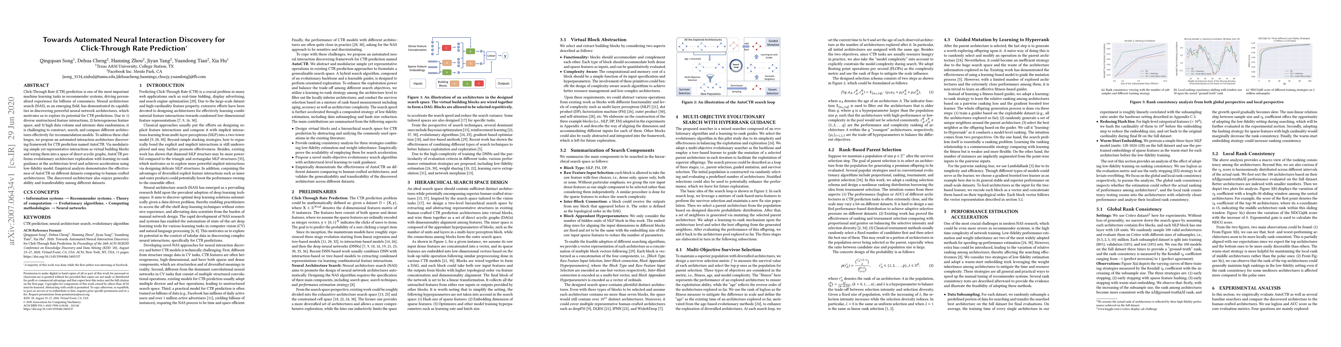 This paper proposes AutoCTR, an automated framework for discovering neural interaction architectures to improve Click-Through Rate (CTR) prediction in recommender systems. AutoCTR uses evolutionary exploration with modular interaction blocks and low-fidelity models to handle the complexities of feature interactions, achieving better performance and generalizability compared to human-designed architectures.