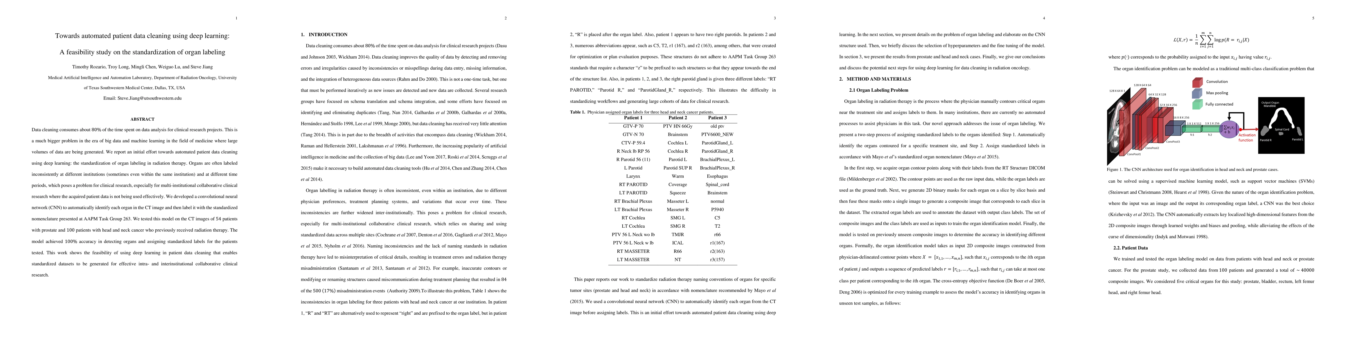 This study explores the use of deep learning to automate patient data cleaning, specifically focusing on the standardization of organ labeling in radiation therapy. A convolutional neural network achieved 100% accuracy in detecting and labeling organs in CT images, demonstrating the feasibility of deep learning for improving clinical research data consistency.