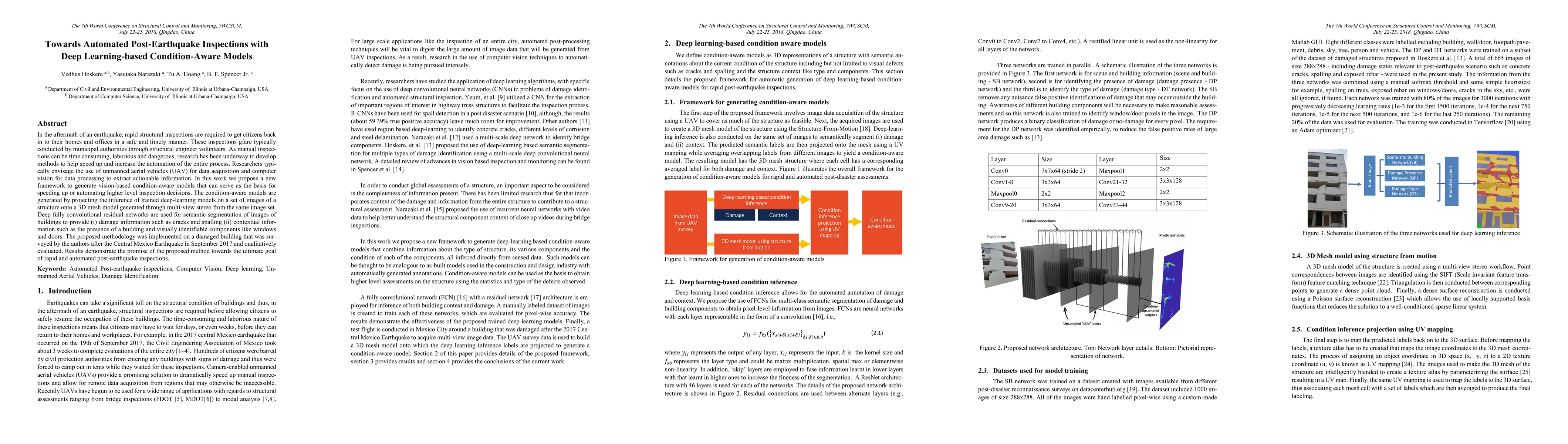 This paper proposes a deep learning-based framework for automated post-earthquake inspections using UAVs and computer vision. The method generates condition-aware 3D models by projecting deep learning segmentation results onto structural meshes, providing damage and contextual information to expedite inspection processes.