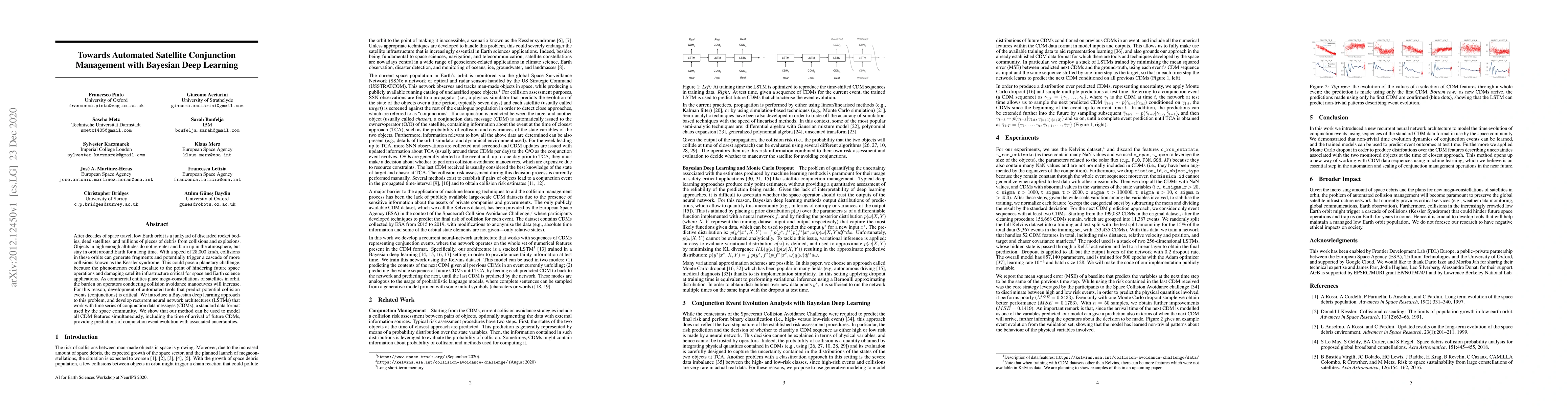 This paper proposes a Bayesian deep learning approach using LSTMs to automate satellite conjunction management, aiming to predict potential collision events in low Earth orbit. The method models time series data from conjunction data messages to forecast conjunction events and their uncertainties, addressing the growing risk of space debris collisions.