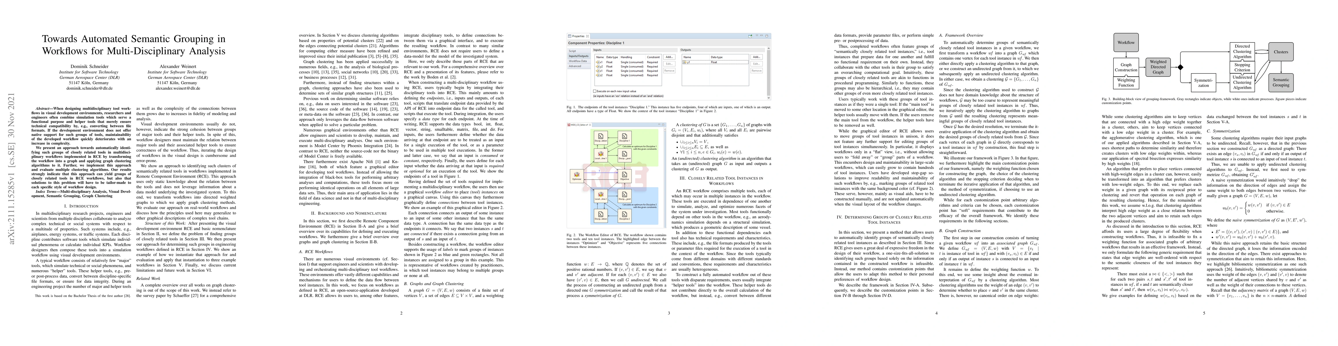 When designing multidisciplinary tool workflows in visual development environments, researchers and engineers often combine simulation tools which serve a functional purpose and helper tools that merely ensure technical compatibility by, e.g., converting between file formats. If the development environment does not offer native support for such groups of tools, maintainability of the developed workflow quickly deteriorates with an increase in complexity. We present an approach towards automatically identifying such groups of closely related tools in multidisciplinary workflows implemented in RCE by transforming the workflow into a graph and applying graph clustering algorithms to it. Further, we implement this approach and evaluate multiple clustering algorithms. Our results strongly indicate that this approach can yield groups of closely related tools in RCE workflows, but also that solutions to this problem will have to be tailor-made to each specific style of workflow design.