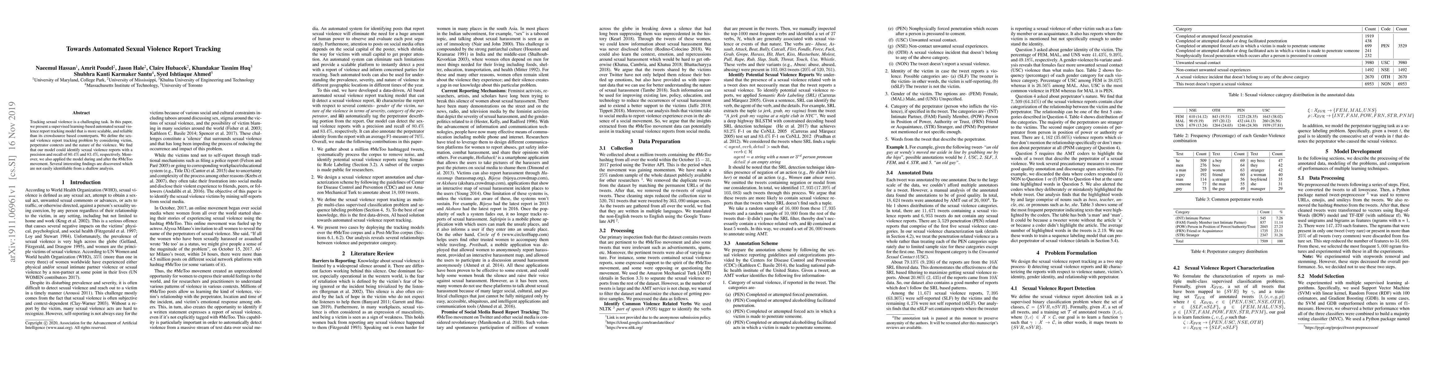 This paper introduces a supervised learning model for automated tracking of sexual violence reports, achieving higher scalability and reliability compared to crowdsourced methods. The model identifies reports with 80.4% precision and 83.4% recall, and its application during the #MeToo movement revealed insights beyond simple analysis.