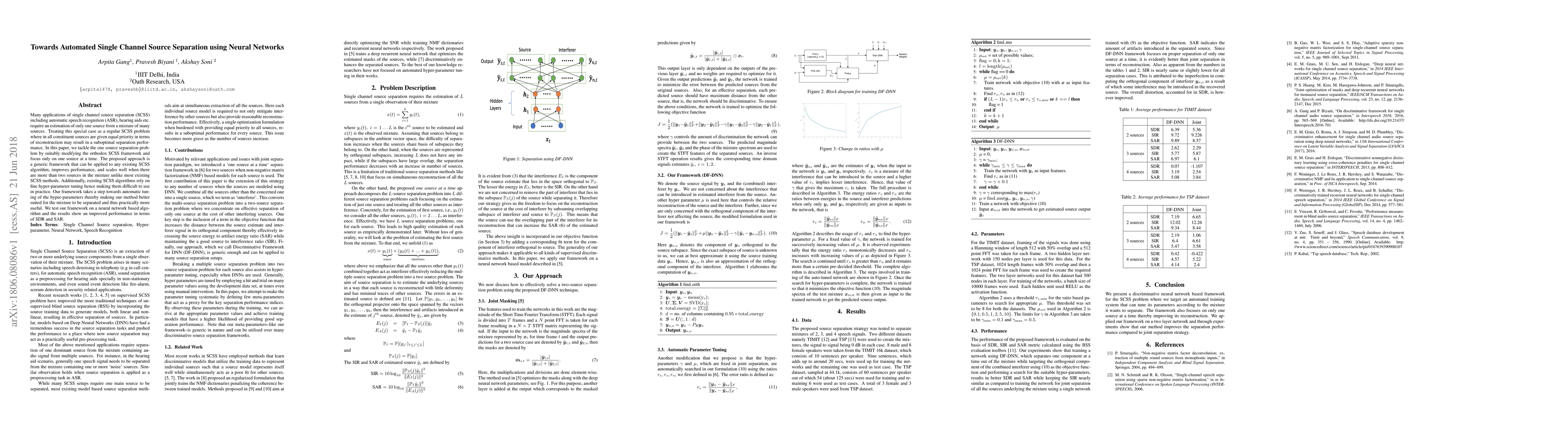 This paper proposes a modified neural network framework for automated single channel source separation, focusing on one source at a time to improve performance over traditional methods. The approach also includes automatic hyper-parameter tuning, making it more practical and scalable for mixtures with multiple sources.