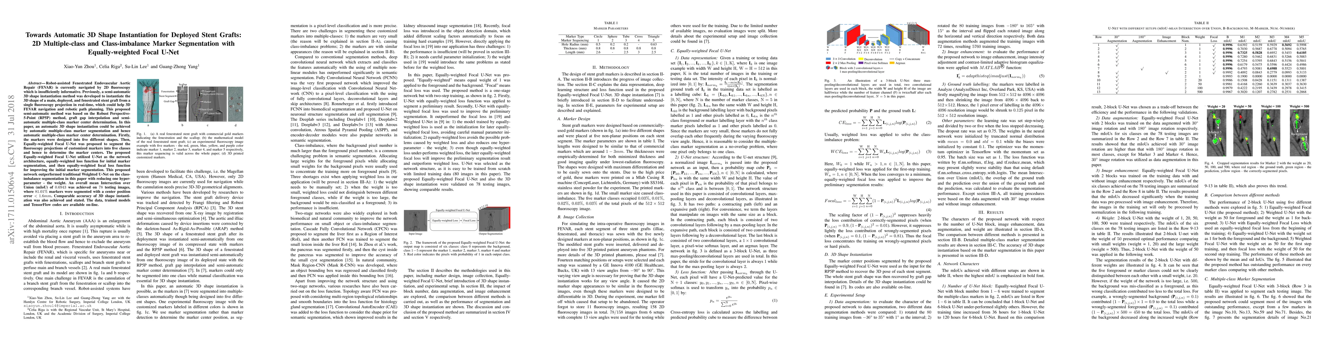 Robot-assisted Fenestrated Endovascular Aortic Repair (FEVAR) is currently navigated by 2D fluoroscopy which is insufficiently informative. Previously, a semi-automatic 3D shape instantiation method was developed to instantiate the 3D shape of a main, deployed, and fenestrated stent graft from a single fluoroscopy projection in real-time, which could help 3D FEVAR navigation and robotic path planning. This proposed semi-automatic method was based on the Robust Perspective-5-Point (RP5P) method, graft gap interpolation and semi-automatic multiple-class marker center determination. In this paper, an automatic 3D shape instantiation could be achieved by automatic multiple-class marker segmentation and hence automatic multiple-class marker center determination. Firstly, the markers were designed into five different shapes. Then, Equally-weighted Focal U-Net was proposed to segment the fluoroscopy projections of customized markers into five classes and hence to determine the marker centers. The proposed Equally-weighted Focal U-Net utilized U-Net as the network architecture, equally-weighted loss function for initial marker segmentation, and then equally-weighted focal loss function for improving the initial marker segmentation. This proposed network outperformed traditional Weighted U-Net on the class-imbalance segmentation in this paper with reducing one hyper-parameter - the weight. An overall mean Intersection over Union (mIoU) of 0.6943 was achieved on 78 testing images, where 81.01% markers were segmented with a center position error <1.6mm. Comparable accuracy of 3D shape instantiation was also achieved and stated. The data, trained models and TensorFlow codes are available on-line.