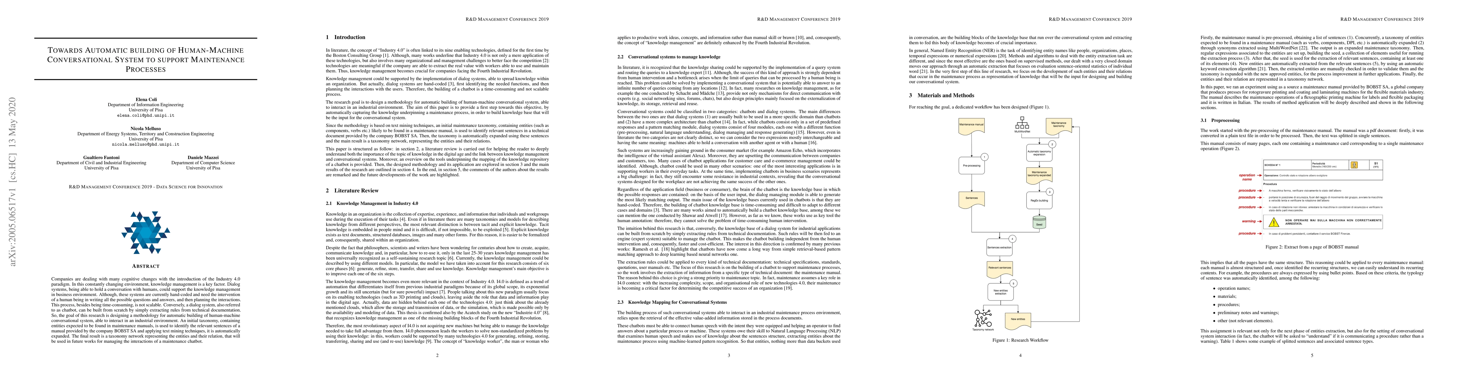 Companies are dealing with many cognitive changes with the introduction of the Industry 4.0 paradigm. In this constantly changing environment, knowledge management is a key factor. Dialog systems, being able to hold a conversation with humans, could support the knowledge management in business environment. Although, these systems are currently hand-coded and need the intervention of a human being in writing all the possible questions and answers, and then planning the interactions. This process, besides being time-consuming, is not scalable. Conversely, a dialog system, also referred to as chatbot, can be built from scratch by simply extracting rules from technical documentation. So, the goal of this research is designing a methodology for automatic building of human-machine conversational system, able to interact in an industrial environment. An initial taxonomy, containing entities expected to be found in maintenance manuals, is used to identify the relevant sentences of a manual provided by the company BOBST SA and applying text mining techniques, it is automatically expanded. The final result is a taxonomy network representing the entities and their relation, that will be used in future works for managing the interactions of a maintenance chatbot.
