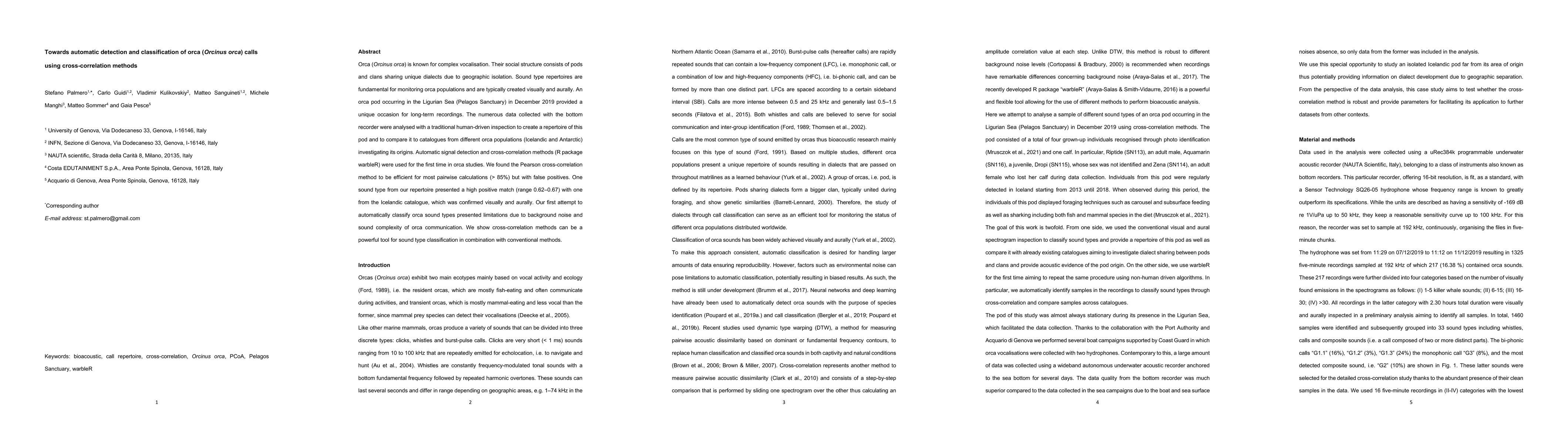 Orca (Orcinus orca) is known for complex vocalisation. Their social structure consists of pods and clans sharing unique dialects due to geographic isolation. Sound type repertoires are fundamental for monitoring orca populations and are typically created visually and aurally. An orca pod occurring in the Ligurian Sea (Pelagos Sanctuary) in December 2019 provided a unique occasion for long-term recordings. The numerous data collected with the bottom recorder were analysed with a traditional human-driven inspection to create a repertoire of this pod and to compare it to catalogues from different orca populations (Icelandic and Antarctic) investigating its origins. Automatic signal detection and cross-correlation methods (R package warbleR) were used for the first time in orca studies. We found the Pearson cross-correlation method to be efficient for most pairwise calculations (> 85%) but with false positives. One sound type from our repertoire presented a high positive match (range 0.62-0.67) with one from the Icelandic catalogue, which was confirmed visually and aurally. Our first attempt to automatically classify orca sound types presented limitations due to background noise and sound complexity of orca communication. We show cross-correlation methods can be a powerful tool for sound type classification in combination with conventional methods.