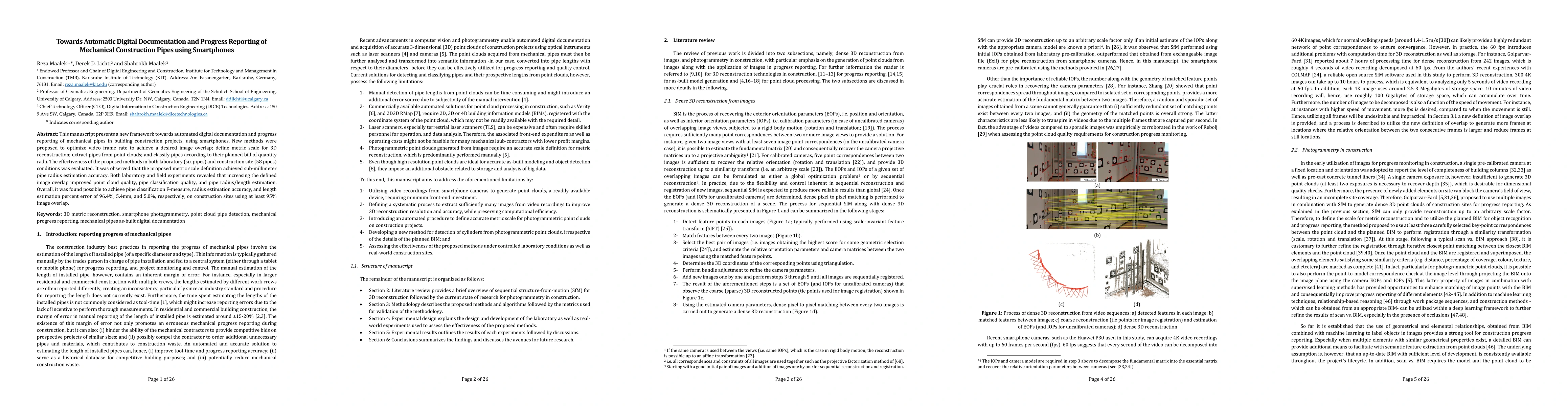 A new framework uses smartphones to automate digital documentation and progress reporting of mechanical pipes in construction projects with high accuracy, achieving 96.4% F-measure for pipe classification.