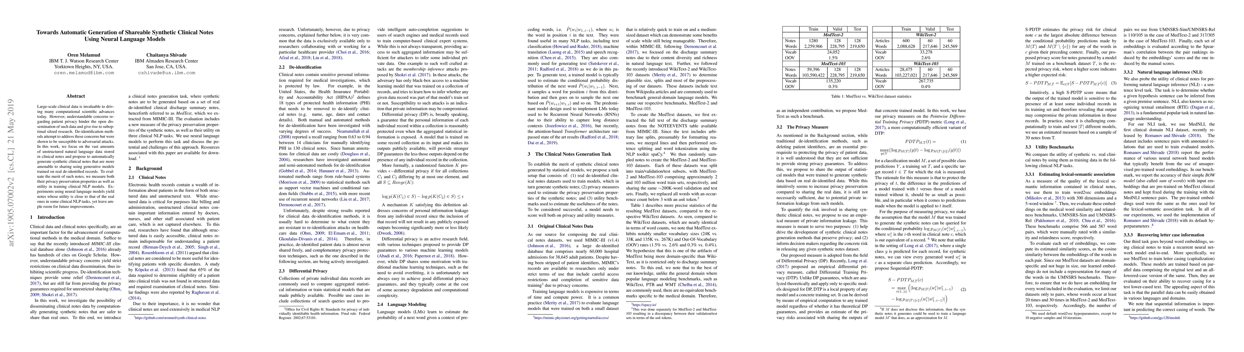 This paper proposes using neural language models to automatically generate synthetic clinical notes that preserve privacy while maintaining utility for training clinical NLP models, aiming to overcome the limitations of current de-identification methods. Initial experiments show promising results in note utility, though further improvements are needed.