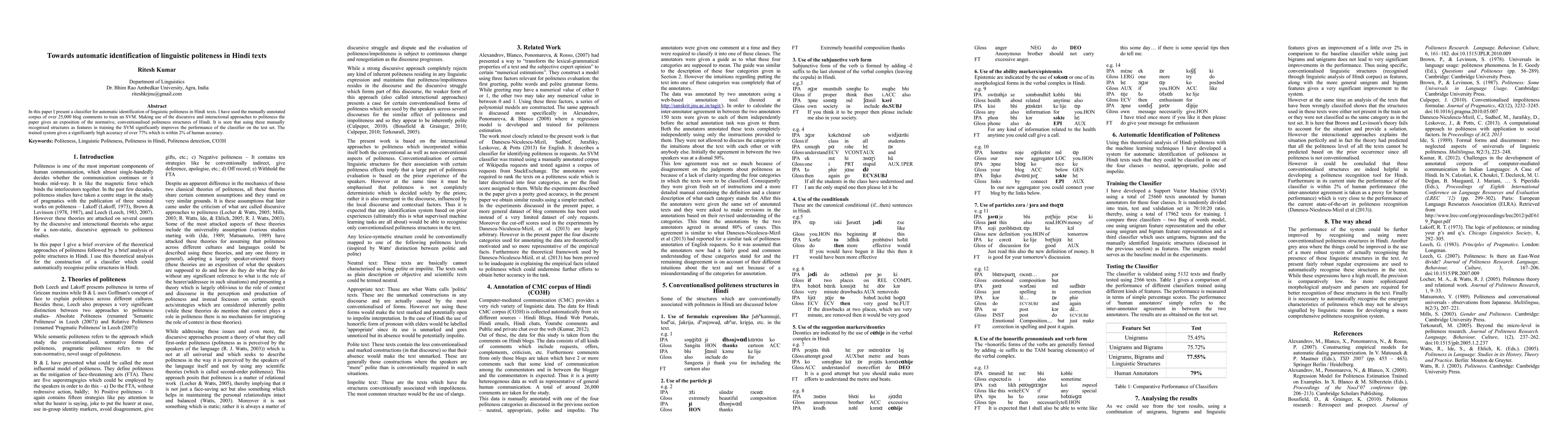 This paper develops an SVM classifier for automatic identification of linguistic politeness in Hindi texts, trained on a manually annotated corpus of over 25,000 blog comments. The classifier's performance is significantly improved by using recognized politeness structures, achieving over 77% accuracy, close to human accuracy.