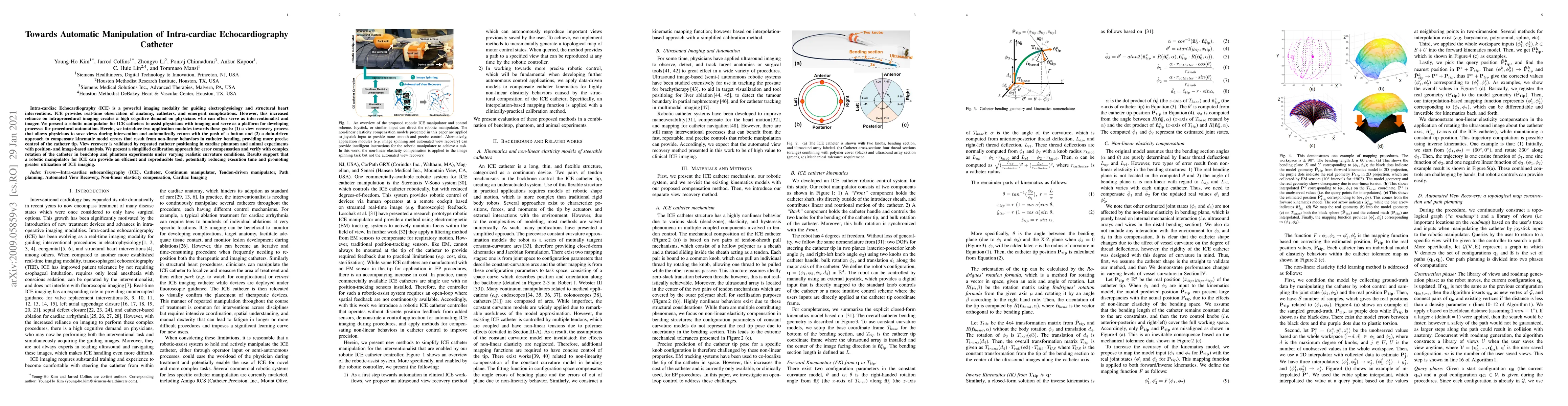 This paper introduces a robotic manipulator to assist with Intra-cardiac Echocardiography (ICE) catheters, aiming to reduce cognitive load on physicians. It presents two modules: a view recovery process for automatic return to saved views, and a data-driven method for compensating kinematic model errors to enhance catheter tip control.