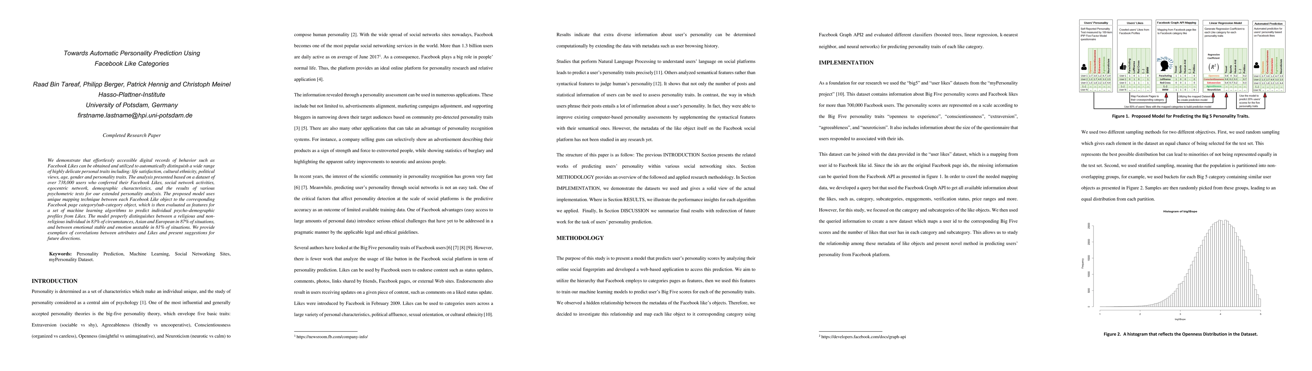 This paper explores using Facebook Likes to automatically predict personal traits like life satisfaction, political views, and personality. It shows high accuracy in distinguishing demographic and psycho-demographic profiles using a unique mapping technique and machine learning algorithms.