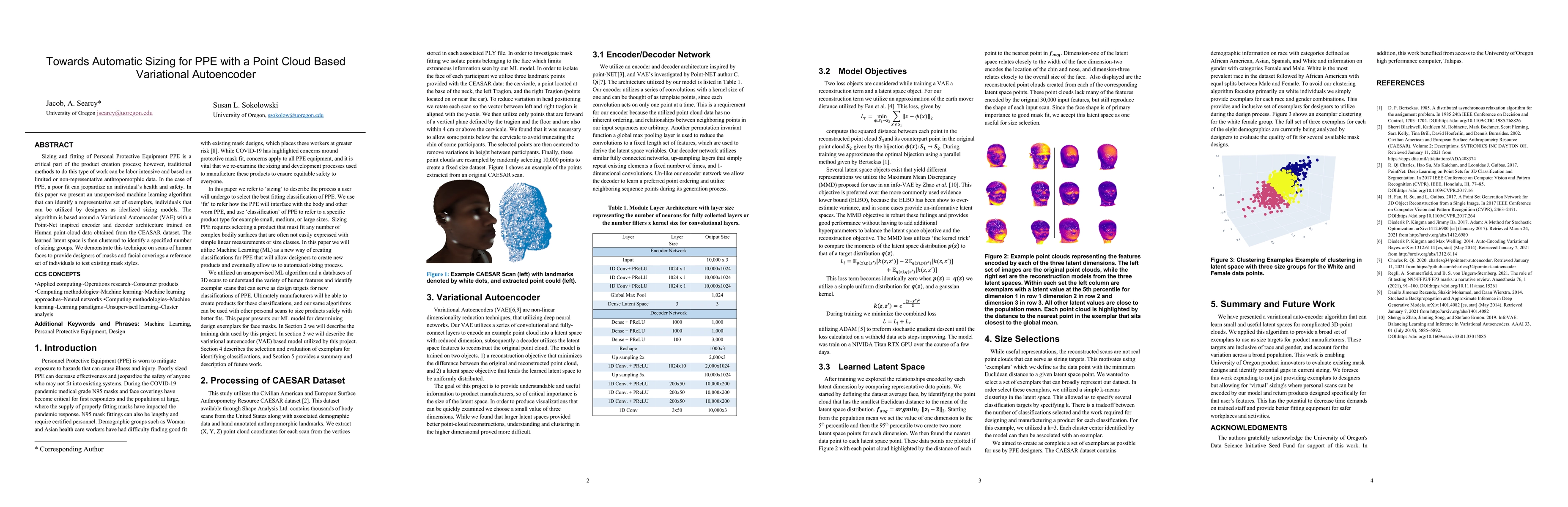 Sizing and fitting of Personal Protective Equipment (PPE) is a critical part of the product creation process; however, traditional methods to do this type of work can be labor intensive and based on limited or non-representative anthropomorphic data. In the case of PPE, a poor fit can jeopardize an individual's health and safety. In this paper we present an unsupervised machine learning algorithm that can identify a representative set of exemplars, individuals that can be utilized by designers as idealized sizing models. The algorithm is based around a Variational Autoencoder (VAE) with a Point-Net inspired encoder and decoder architecture trained on Human point-cloud data obtained from the CEASAR dataset. The learned latent space is then clustered to identify a specified number of sizing groups. We demonstrate this technique on scans of human faces to provide designers of masks and facial coverings a reference set of individuals to test existing mask styles.