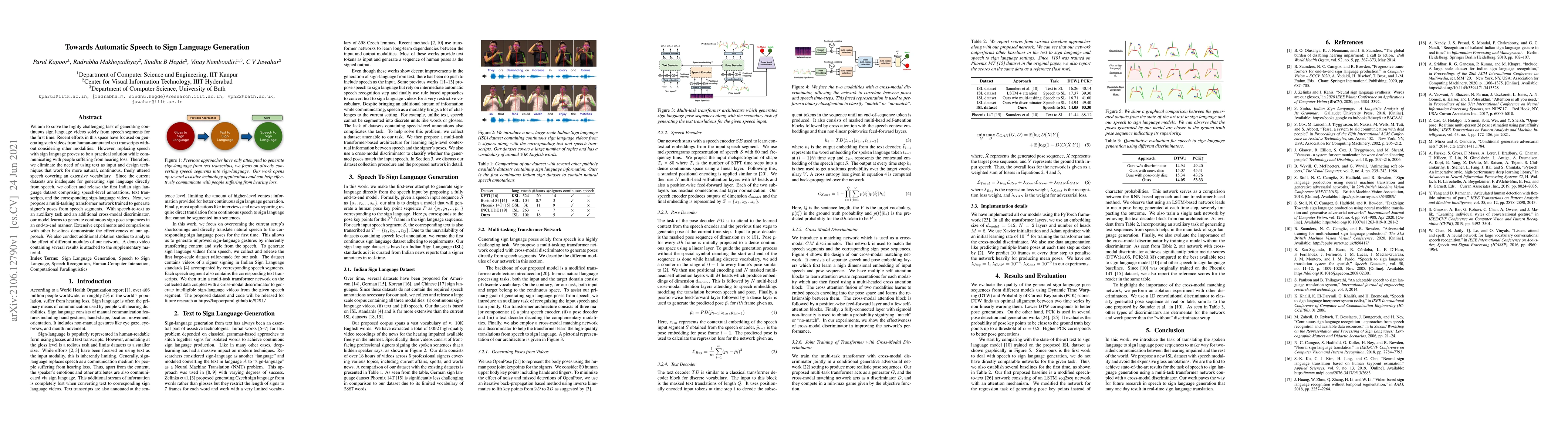 The paper proposes a multi-task transformer network for generating sign language poses directly from speech segments. It introduces a cross-modal discriminator to enhance the quality of generated pose sequences. The model is trained on a newly collected Indian Sign Language (ISL) dataset containing speech-level annotations, text transcripts, and corresponding sign-language videos.
