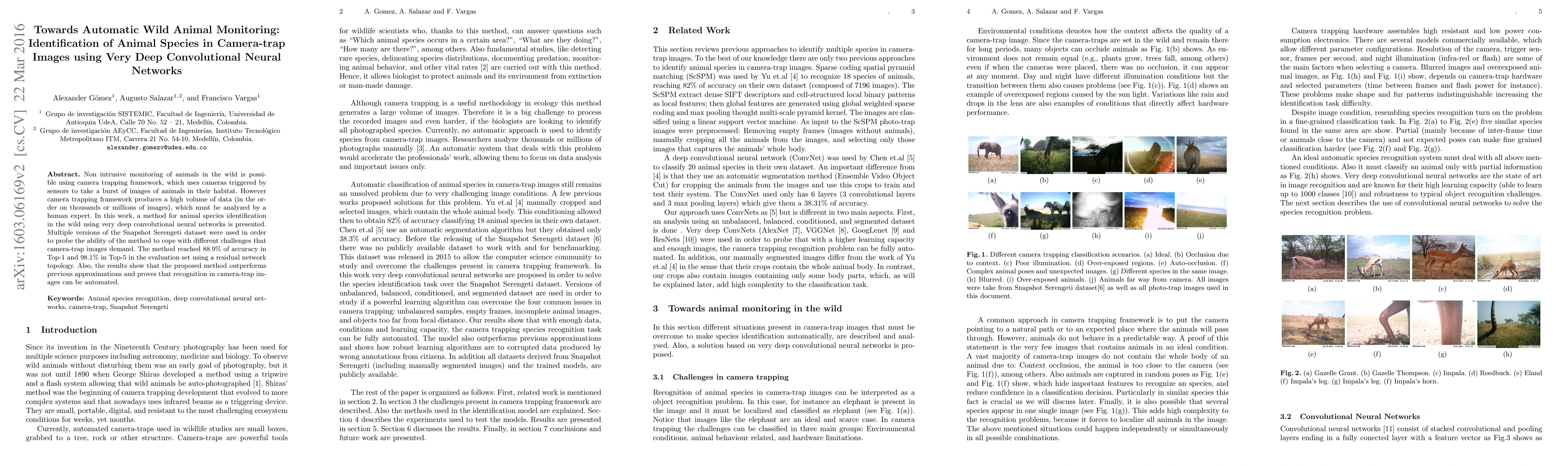Non intrusive monitoring of animals in the wild is possible using camera trapping framework, which uses cameras triggered by sensors to take a burst of images of animals in their habitat. However camera trapping framework produces a high volume of data (in the order on thousands or millions of images), which must be analyzed by a human expert. In this work, a method for animal species identification in the wild using very deep convolutional neural networks is presented. Multiple versions of the Snapshot Serengeti dataset were used in order to probe the ability of the method to cope with different challenges that camera-trap images demand. The method reached 88.9% of accuracy in Top-1 and 98.1% in Top-5 in the evaluation set using a residual network topology. Also, the results show that the proposed method outperforms previous approximations and proves that recognition in camera-trap images can be automated.