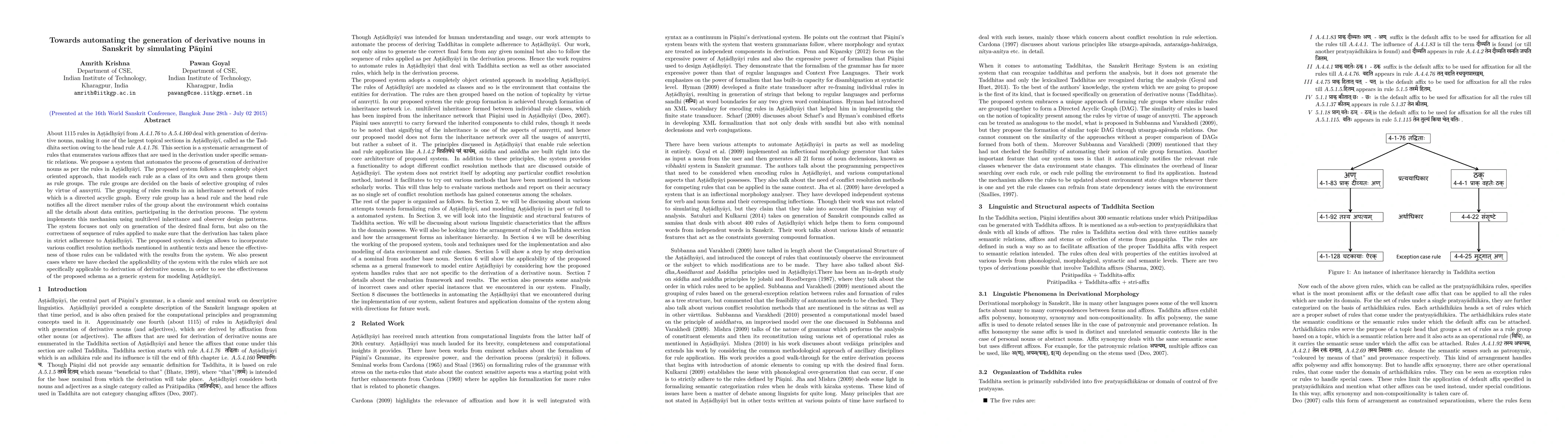 This paper proposes an automated system for generating derivative nouns in Sanskrit based on Panini's Astadhyayi rules, specifically the Taddhita section. The system employs an object-oriented approach with multilevel inheritance and observer patterns to model and execute the rules, ensuring adherence to the correct sequence and validating conflict resolution methods.