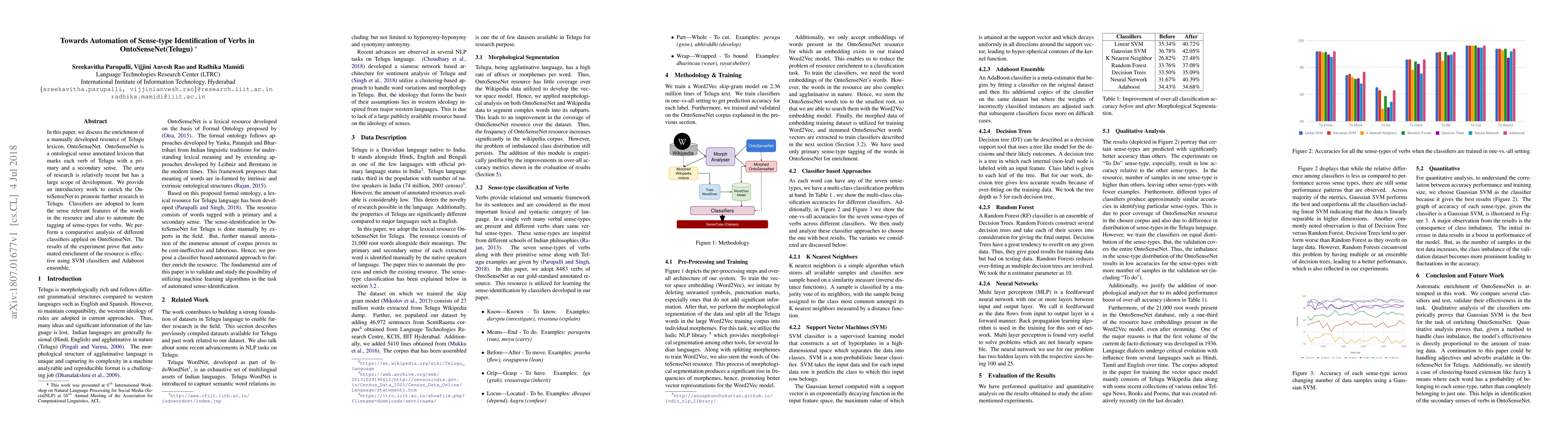 In this paper, we discuss the enrichment of a manually developed resource of Telugu lexicon, OntoSenseNet. OntoSenseNet is a ontological sense annotated lexicon that marks each verb of Telugu with a primary and a secondary sense. The area of research is relatively recent but has a large scope of development. We provide an introductory work to enrich the OntoSenseNet to promote further research in Telugu. Classifiers are adopted to learn the sense relevant features of the words in the resource and also to automate the tagging of sense-types for verbs. We perform a comparative analysis of different classifiers applied on OntoSenseNet. The results of the experiment prove that automated enrichment of the resource is effective using SVM classifiers and Adaboost ensemble.
