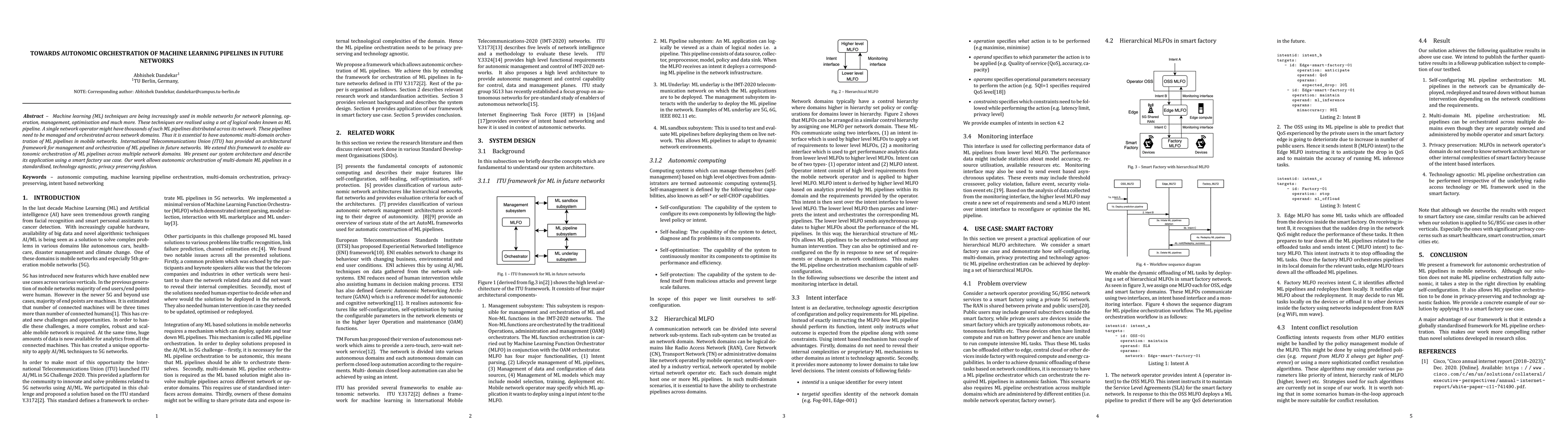 This paper proposes an autonomic orchestration framework for managing thousands of machine learning pipelines across multiple network domains in mobile networks, extending the ITU framework. It presents a system architecture and demonstrates its application in a smart factory scenario, ensuring standardized, technology-agnostic, and privacy-preserving orchestration.
