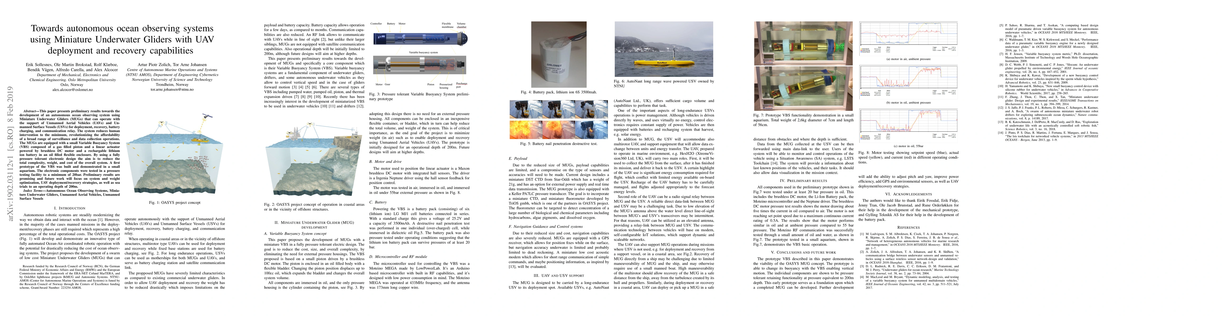This paper presents preliminary results towards the development of an autonomous ocean observing system using Miniature Underwater Gliders (MUGs) that can operate with the support of Unmanned Aerial Vehicles (UAVs) and Unmanned Surface Vessels (USVs) for deployment, recovery, battery charging, and communication relay. The system reduces human intervention to the minimum, revolutionizing the affordability of a broad range of surveillance and data collection operations. The MUGs are equipped with a small Variable Buoyancy System (VBS) composed of a gas filled piston and a linear actuator powered by brushless DC motor and a rechargable lithium ion battery in an oil filled flexible enclosure. By using a fully pressure tolerant electronic design the aim is to reduce the total complexity, weight, and cost of the overall system. A first prototype of the VBS was built and demonstrated in a small aquarium. The electronic components were tested in a pressure testing facility to a minimum of 20bar. Preliminary results are promising and future work will focus on system and weight optimization, UAV deployment/recovery strategies, as well as sea trials to an operating depth of 200m.