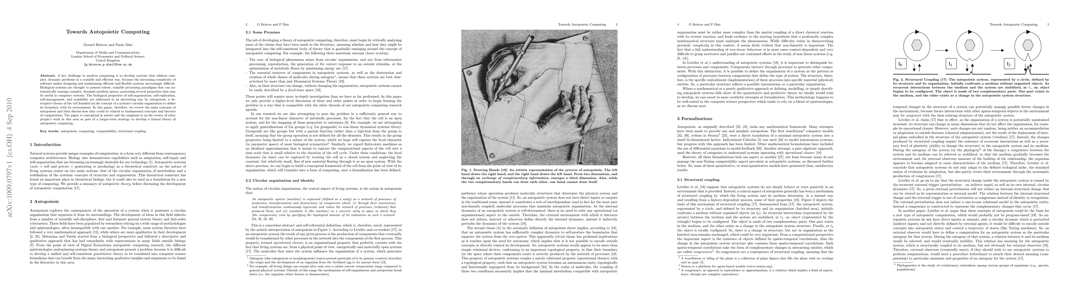 A key challenge in modern computing is to develop systems that address complex, dynamic problems in a scalable and efficient way, because the increasing complexity of software makes designing and maintaining efficient and flexible systems increasingly difficult. Biological systems are thought to possess robust, scalable processing paradigms that can automatically manage complex, dynamic problem spaces, possessing several properties that may be useful in computer systems. The biological properties of self-organisation, self-replication, self-management, and scalability are addressed in an interesting way by autopoiesis, a descriptive theory of the cell founded on the concept of a system's circular organisation to define its boundary with its environment. In this paper, therefore, we review the main concepts of autopoiesis and then discuss how they could be related to fundamental concepts and theories of computation. The paper is conceptual in nature and the emphasis is on the review of other people's work in this area as part of a longer-term strategy to develop a formal theory of autopoietic computing.