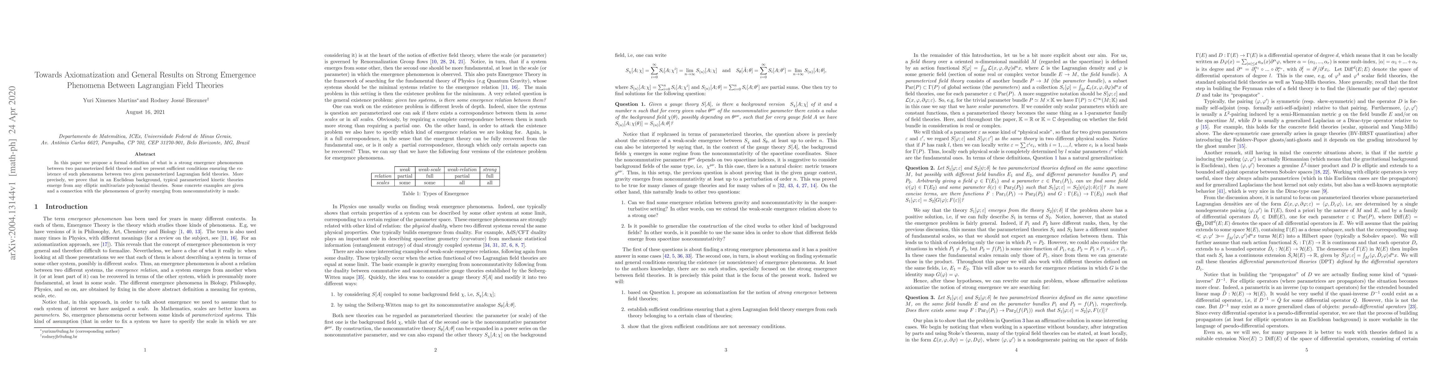 In this paper we propose a formal definition of what is a strong emergence phenomenon between two parameterized field theories and we present sufficient conditions ensuring the existence of such phenomena between two given parameterized Lagrangian field theories. More precisely, we prove that in an Euclidean background, typical parameterized kinetic theories emerge from any elliptic multivariate polynomial theories. Some concrete examples are given and a connection with the phenomenon of gravity emerging from noncommutativity is made.