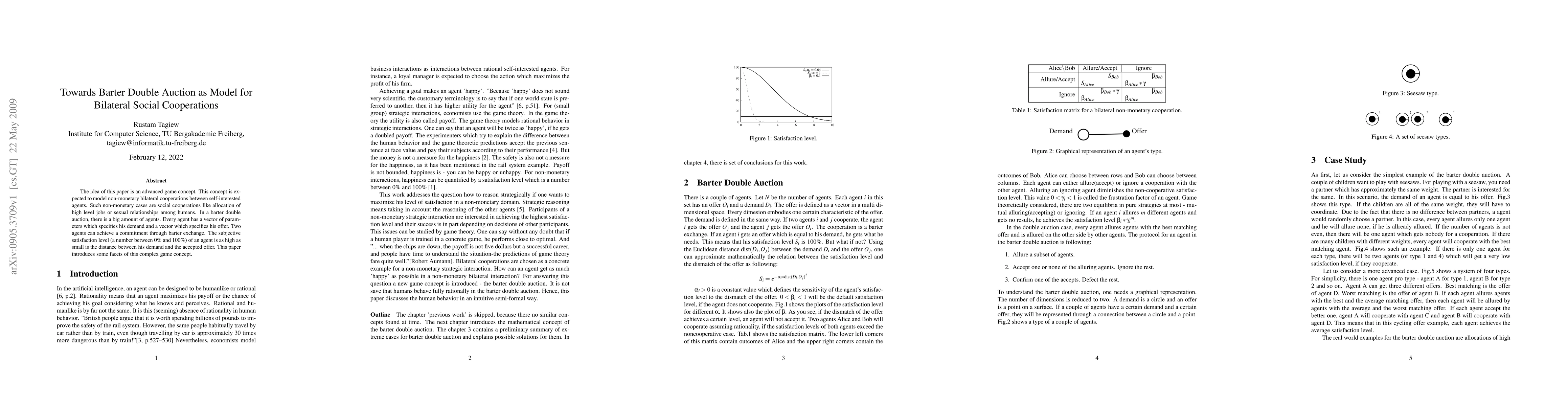 The idea of this paper is an advanced game concept. This concept is expected to model non-monetary bilateral cooperations between self-interested agents. Such non-monetary cases are social cooperations like allocation of high level jobs or sexual relationships among humans. In a barter double auction, there is a big amount of agents. Every agent has a vector of parameters which specifies his demand and a vector which specifies his offer. Two agents can achieve a commitment through barter exchange. The subjective satisfaction level (a number between 0% and 100%) of an agent is as high as small is the distance between his demand and the accepted offer. This paper introduces some facets of this complex game concept.