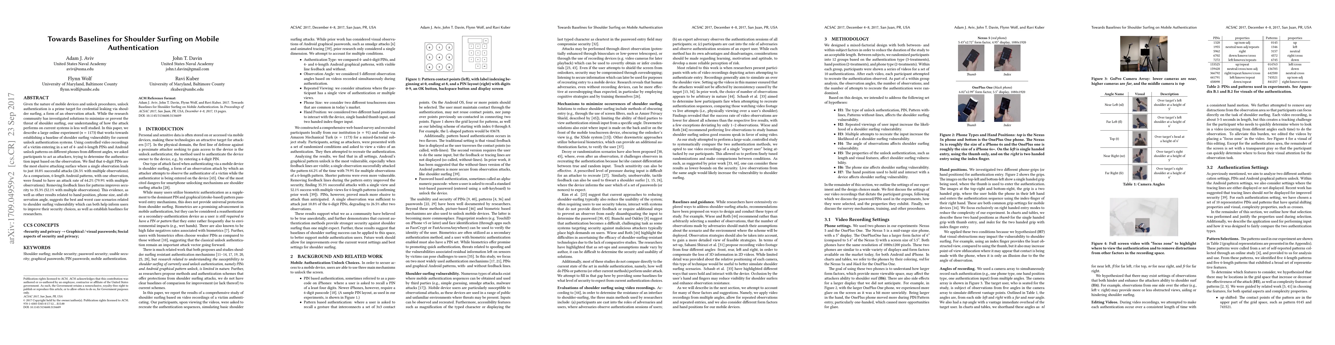 This paper conducts a large online experiment to establish a baseline for shoulder surfing vulnerabilities in mobile authentication systems. Results show that 6-digit PINs are more secure than 6-length Android patterns, with attack rates improving significantly with multiple observations, highlighting the need for better security measures.
