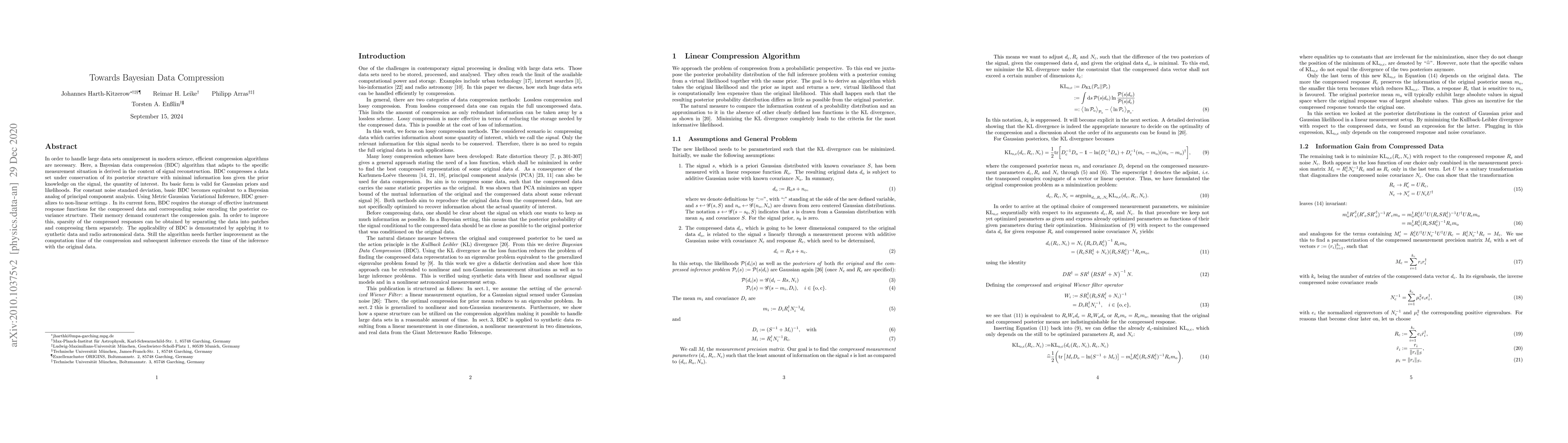 In order to handle large data sets omnipresent in modern science, efficient compression algorithms are necessary. Here, a Bayesian data compression (BDC) algorithm that adapts to the specific measurement situation is derived in the context of signal reconstruction. BDC compresses a data set under conservation of its posterior structure with minimal information loss given the prior knowledge on the signal, the quantity of interest. Its basic form is valid for Gaussian priors and likelihoods. For constant noise standard deviation, basic BDC becomes equivalent to a Bayesian analog of principal component analysis. Using Metric Gaussian Variational Inference, BDC generalizes to non-linear settings. In its current form, BDC requires the storage of effective instrument response functions for the compressed data and corresponding noise encoding the posterior covariance structure. Their memory demand counteract the compression gain. In order to improve this, sparsity of the compressed responses can be obtained by separating the data into patches and compressing them separately. The applicability of BDC is demonstrated by applying it to synthetic data and radio astronomical data. Still the algorithm needs further improvement as the computation time of the compression and subsequent inference exceeds the time of the inference with the original data.