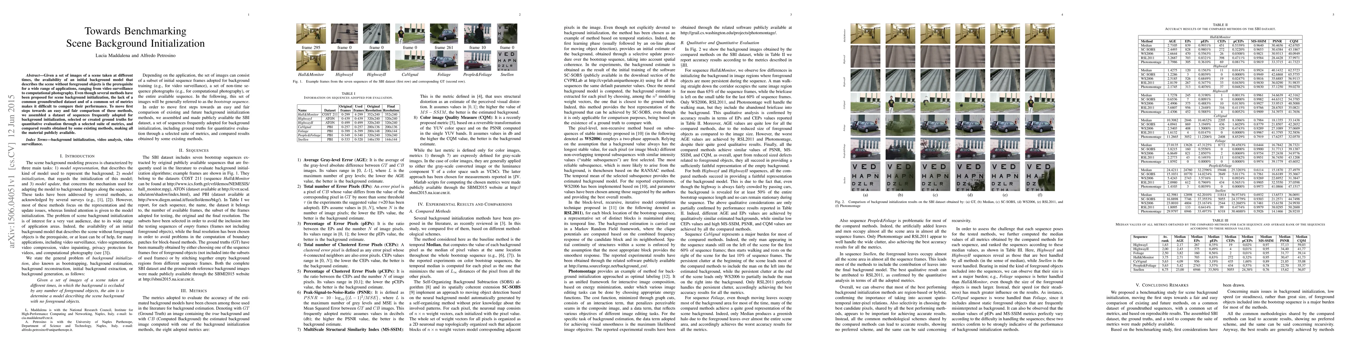 This paper introduces a benchmark dataset and evaluation metrics for scene background initialization, aiming to facilitate fair comparisons between existing methods. The authors provide groundtruthed data and a suite of metrics, making all materials publicly available for future research.