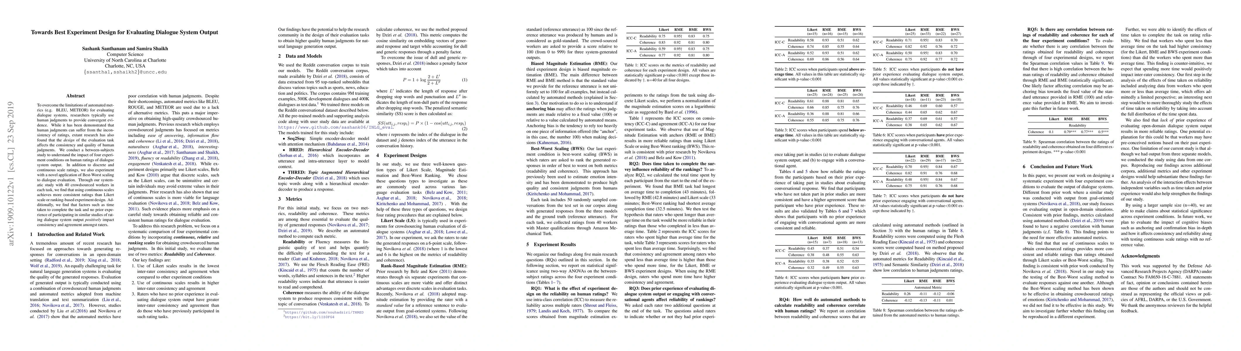 This paper investigates the best experimental design for evaluating dialogue system outputs using human judgments, finding that continuous scales yield more consistent ratings compared to Likert scales or ranking methods. The study also reveals that factors like task completion time and lack of prior experience in similar evaluations positively influence rater consistency.