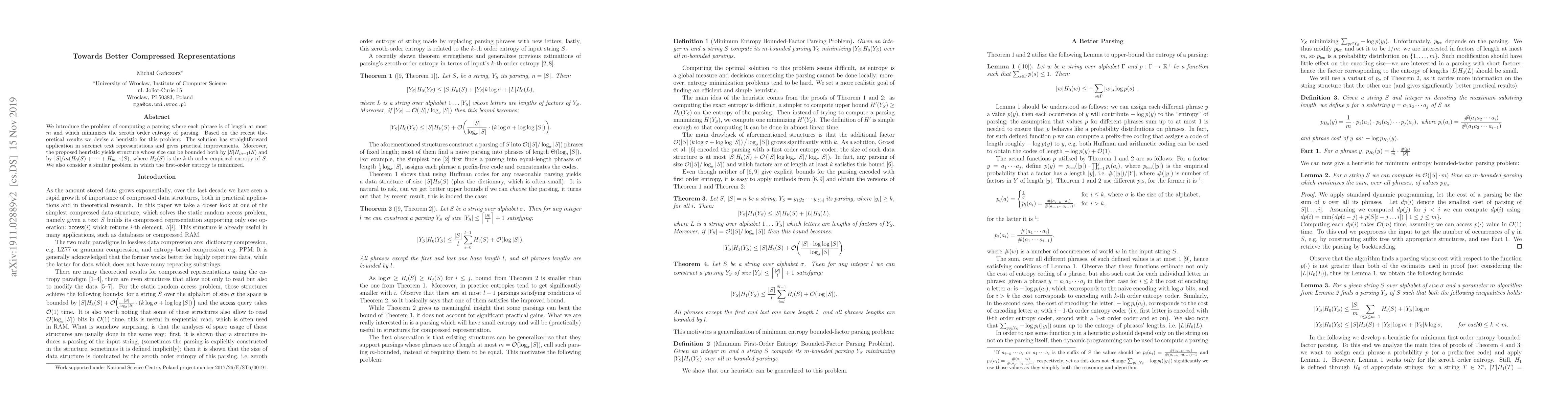 We introduce the problem of computing a parsing where each phrase is of length at most $m$ and which minimizes the zeroth order entropy of parsing. Based on the recent theoretical results we devise a heuristic for this problem. The solution has straightforward application in succinct text representations and gives practical improvements. Moreover the proposed heuristic yields structure whose size can be bounded both by $|S|H_{m-1}(S)$ and by $|S|/m(H_0(S) + \cdots + H_{m-1})$, where $H_{k}(S)$ is the $k$-th order empirical entropy of $S$. We also consider a similar problem in which the first-order entropy is minimized.