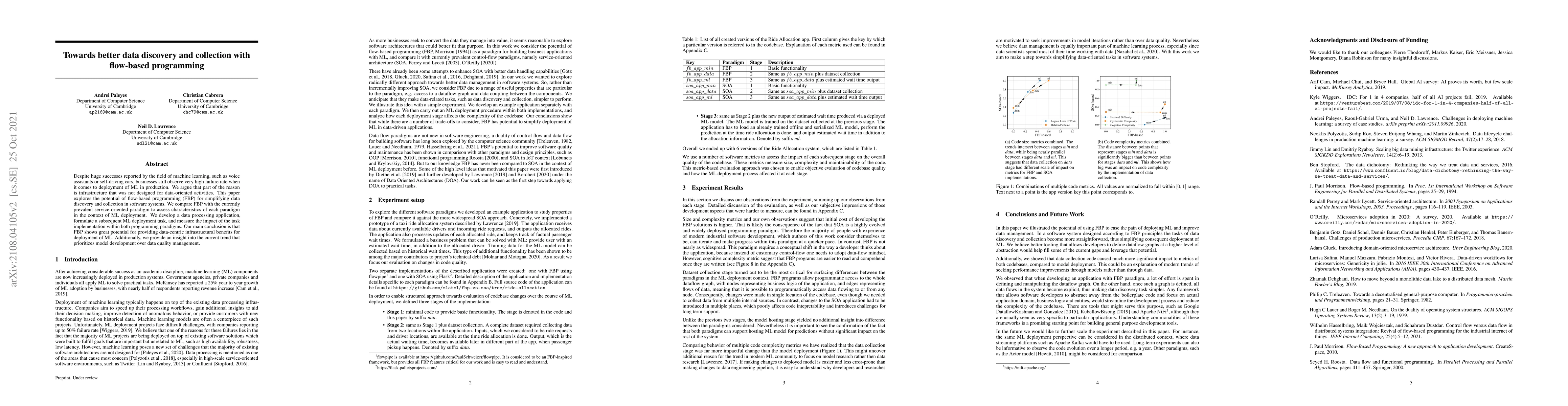 Despite huge successes reported by the field of machine learning, such as voice assistants or self-driving cars, businesses still observe very high failure rate when it comes to deployment of ML in production. We argue that part of the reason is infrastructure that was not designed for data-oriented activities. This paper explores the potential of flow-based programming (FBP) for simplifying data discovery and collection in software systems. We compare FBP with the currently prevalent service-oriented paradigm to assess characteristics of each paradigm in the context of ML deployment. We develop a data processing application, formulate a subsequent ML deployment task, and measure the impact of the task implementation within both programming paradigms. Our main conclusion is that FBP shows great potential for providing data-centric infrastructural benefits for deployment of ML. Additionally, we provide an insight into the current trend that prioritizes model development over data quality management.