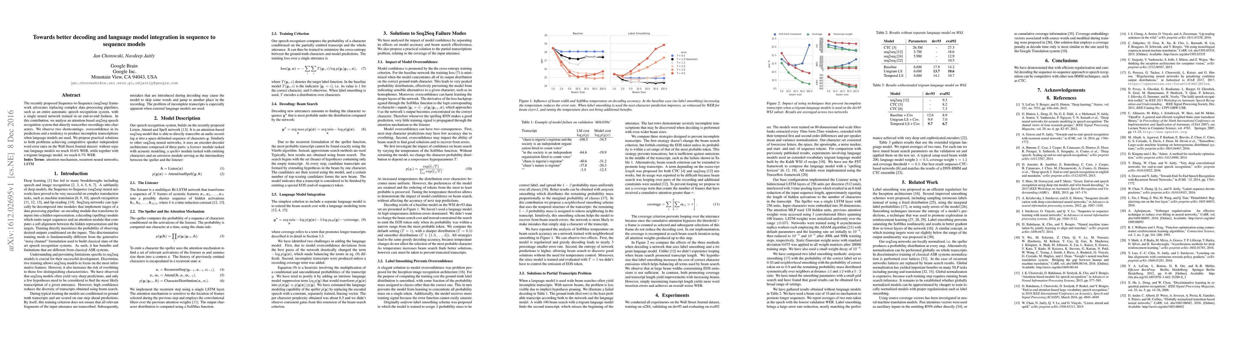 This paper investigates an attention-based seq2seq model for speech recognition, identifying overconfidence and incomplete transcriptions as key issues. Proposed solutions improve performance, achieving 10.6% WER without and 6.7% WER with a trigram language model on the Wall Street Journal dataset.