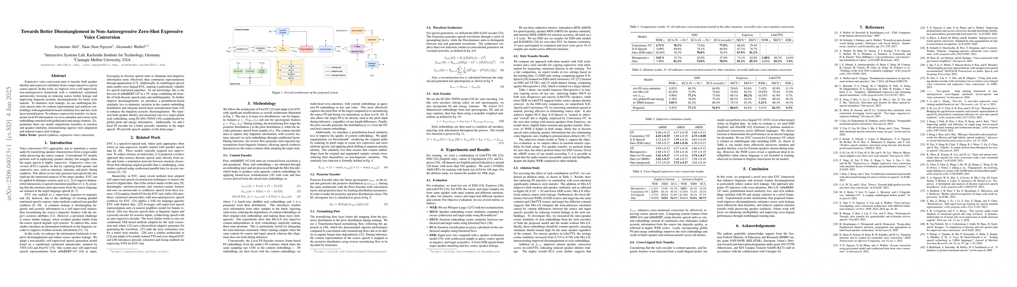 Researchers improved expressive voice conversion by reducing style leakage and enhancing disentanglement of speaker identity and emotional expression, achieving better style transfer and reduced source style leakage.