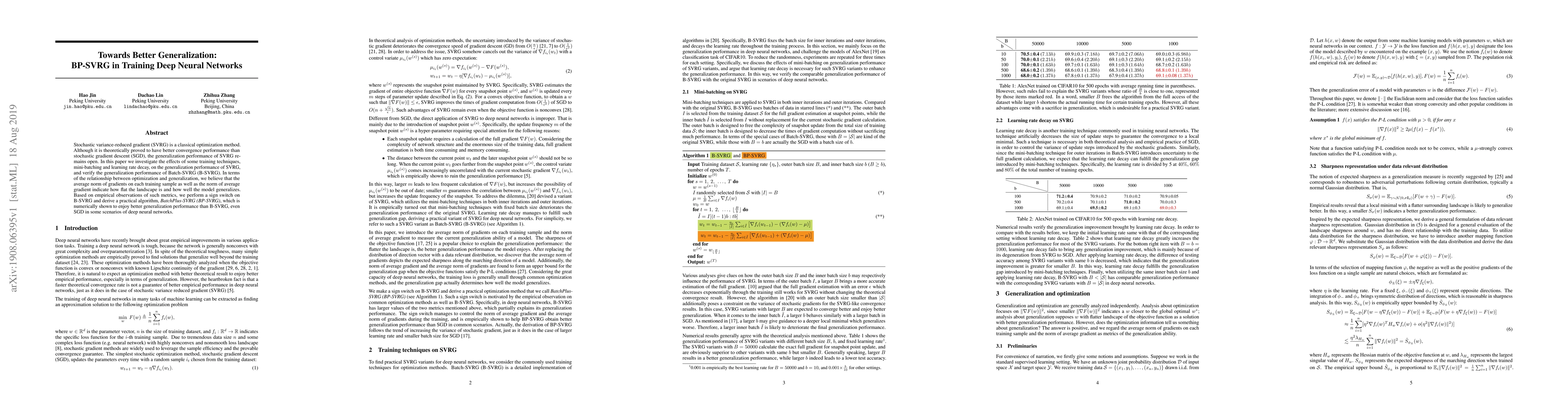 This paper investigates the generalization performance of Batch-SVRG (B-SVRG) in training deep neural networks, finding that it can outperform stochastic gradient descent (SGD). It introduces BatchPlus-SVRG (BP-SVRG), a modified version that shows improved generalization performance over both B-SVRG and SGD, based on empirical metrics related to gradient norms.